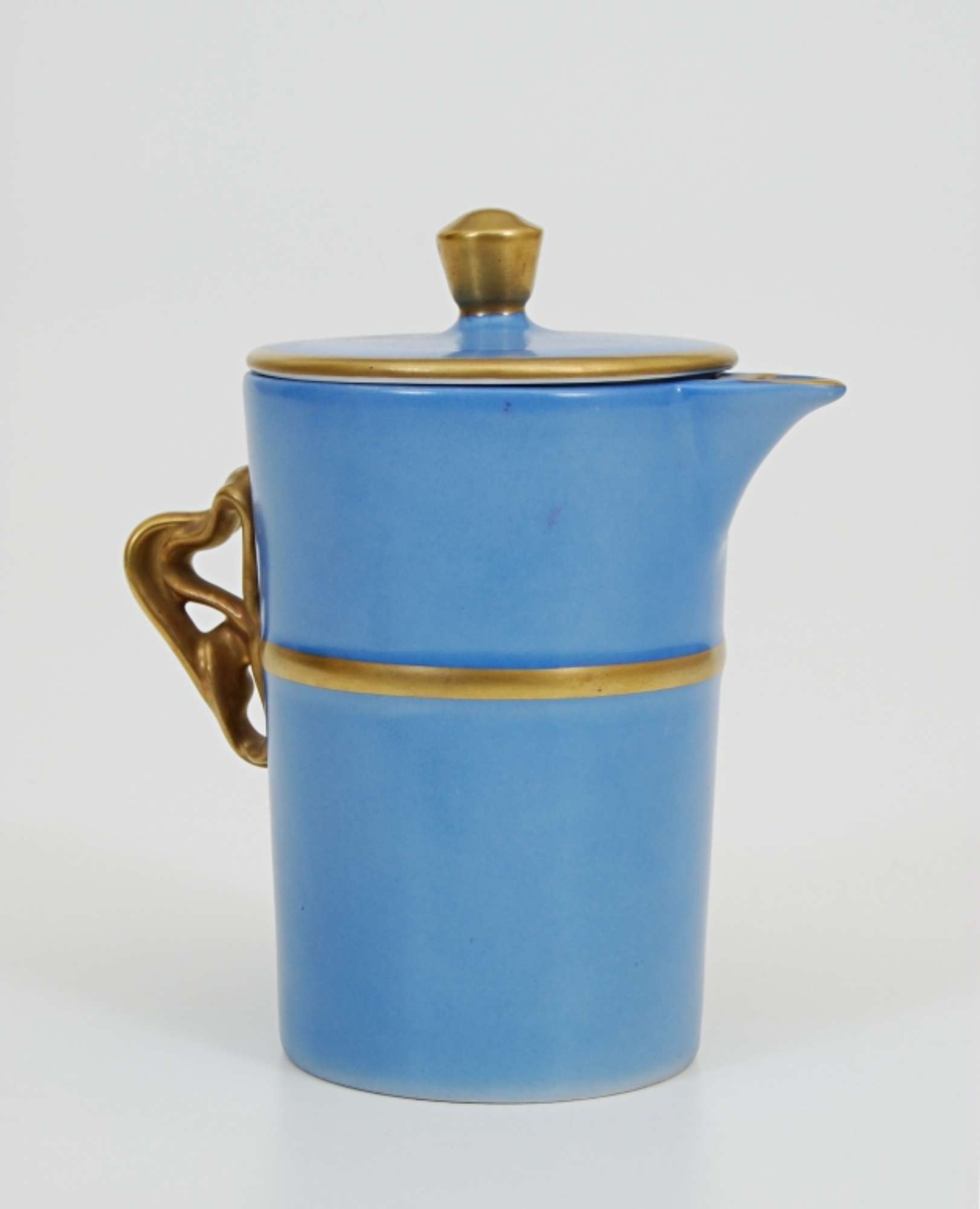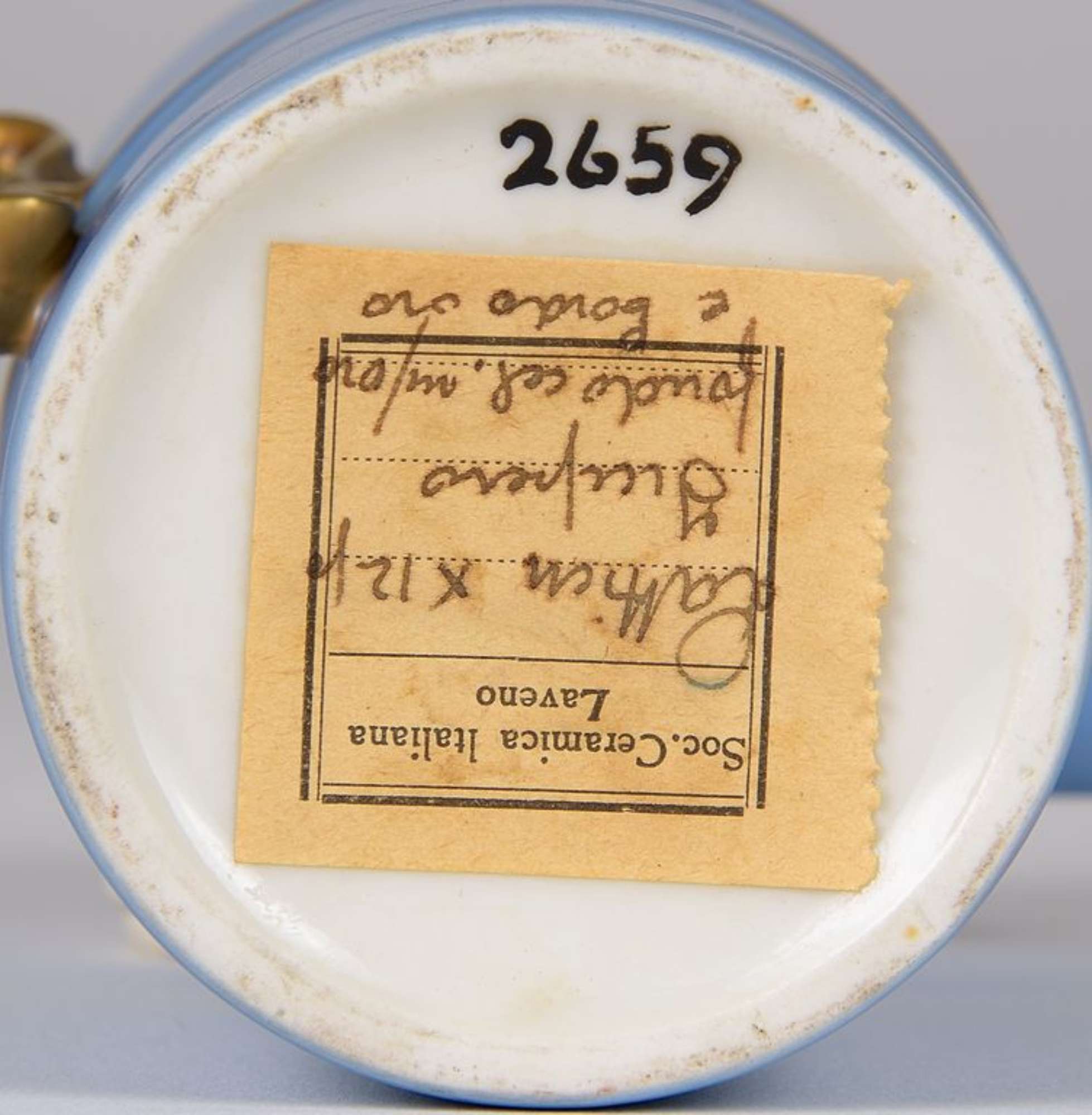 Cilindrica, con cordone in rilievo a metà ventre e manici a nastro; coperchio piatto. Smalto azzurro e manici, cordone al ventre, pomello, e filetto all'orlo del coperchio in oro. Nel rovescio marca di fabbrica. (Servizio azzurro e oro, forma impero).