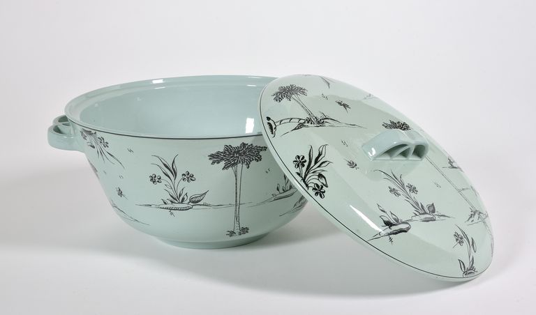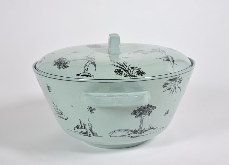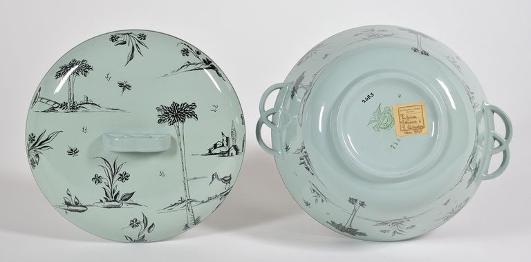 Troncoconica, con coperchio e manici a foggia di due semicerchi intrecciati; forma "Vittuone". Decorazione ad alberelli, ciuffi d'erba fiorita e gruppo di casette, dipinta in nero sul fondo verde grigiastro dello smalto. Nel rovescio in verde marca dell'aquila "Società Ceramica Italiana Laveno 713(/8)" e un'etichetta cartacea che riporta "Zuppiera/ Vittuone 2/ P. Celadon/ dec. 713/8".