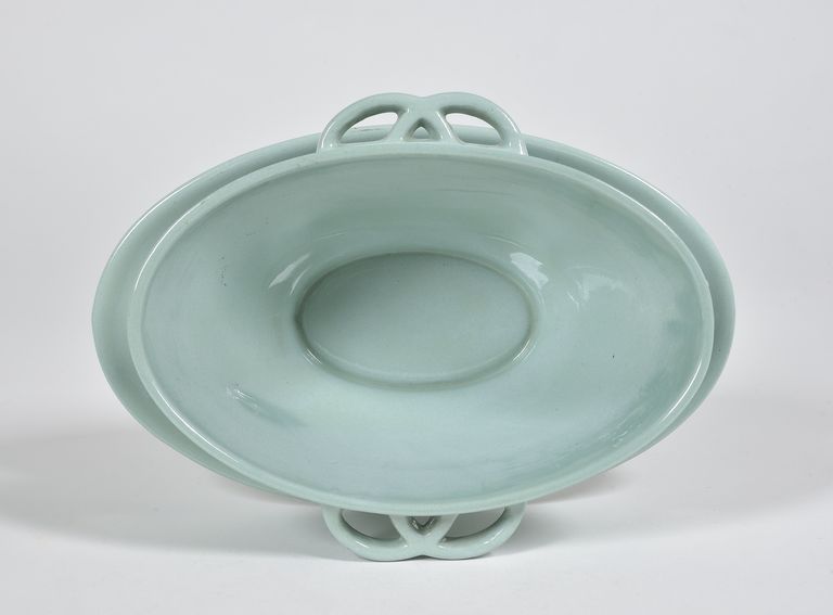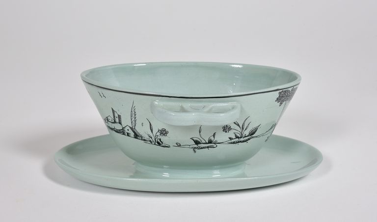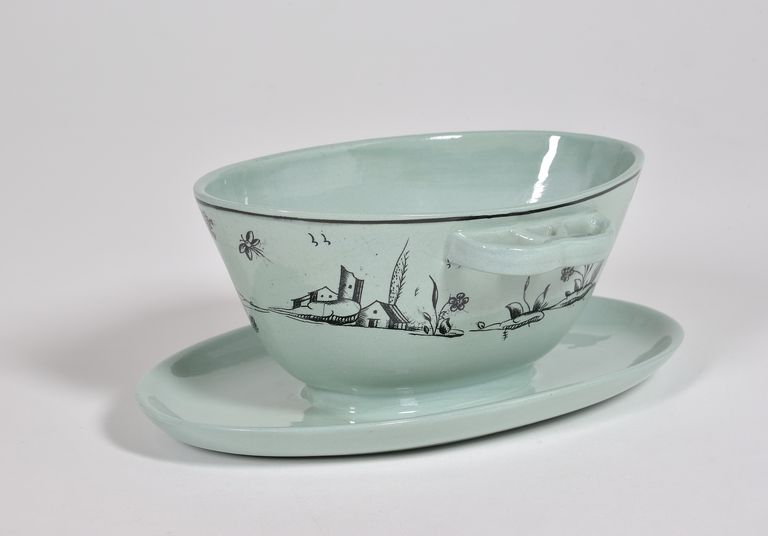 Ovale, piattino ovale attaccato, manici a semicerchi intrecciati; forma "Vittuone". Decorazione ad alberelli, ciuffi d'erba fiorita e gruppo di casette, dipinta in nero sul fondo verde grigiastro dello smalto. Nel rovescio in verde marca dell'aquila "Società Ceramica Italiana Laveno 713/8" e un'etichetta cartacea che riporta "Salsiera/ Vittuone/ P. Celadon/ dec. 713/8".