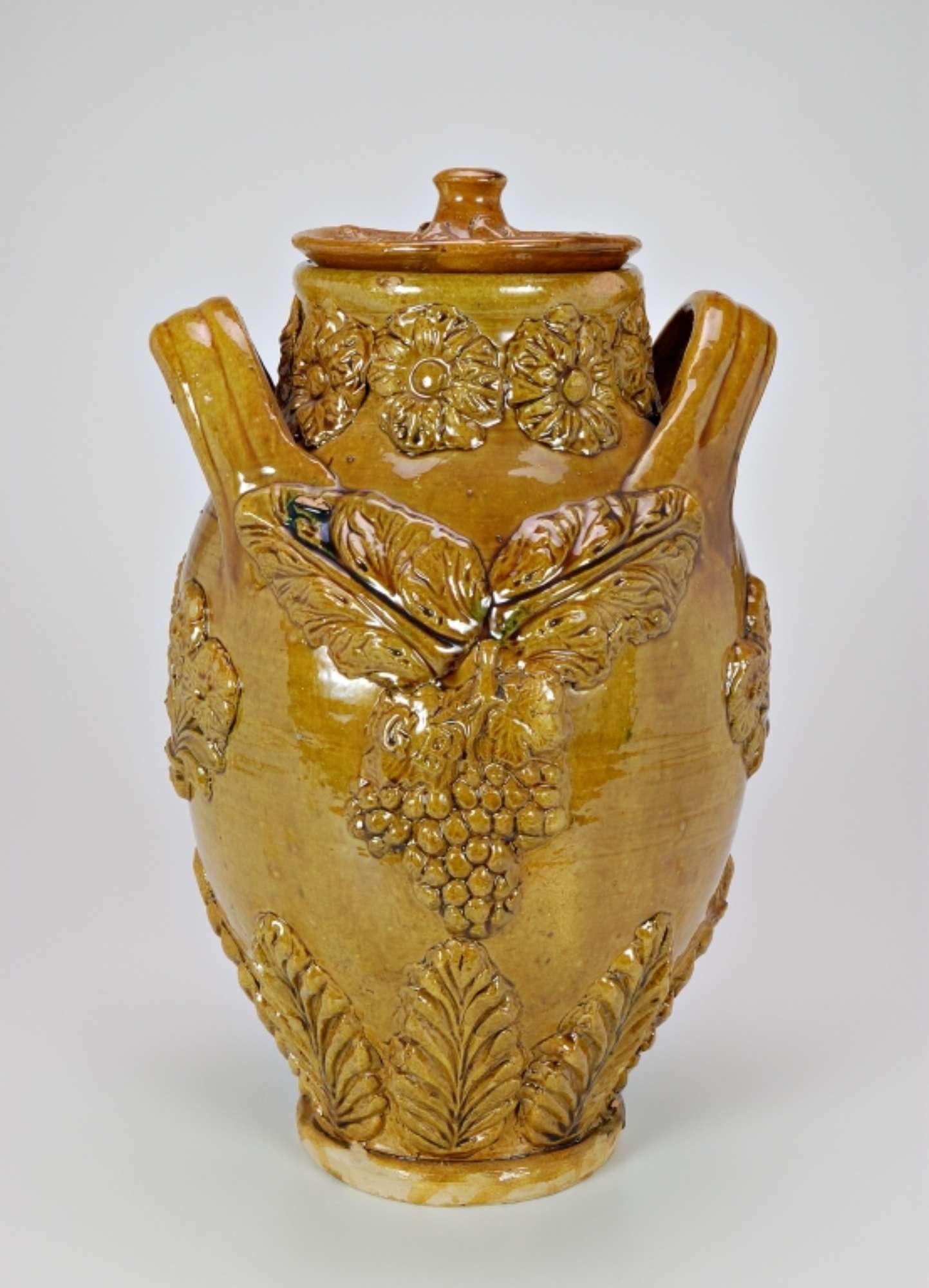 Orcio (vaso da miele) a forma ovoidale su base cercinata con orlo estroflesso e due manici a fascia verticali sagomati e contrapposti (detto "burnia"). Decori plasticati a rilevo ornano la superficie esterna del vaso: foglie nervate alla base, rosoni alla bocca, sul corpo grappoli d'uva e fiori. Sul grappolo d'uva in rilievo sono presenti le iniziali "GB". Coperchio piatto con presa centrale. Ricoperto con vetrina gialla.