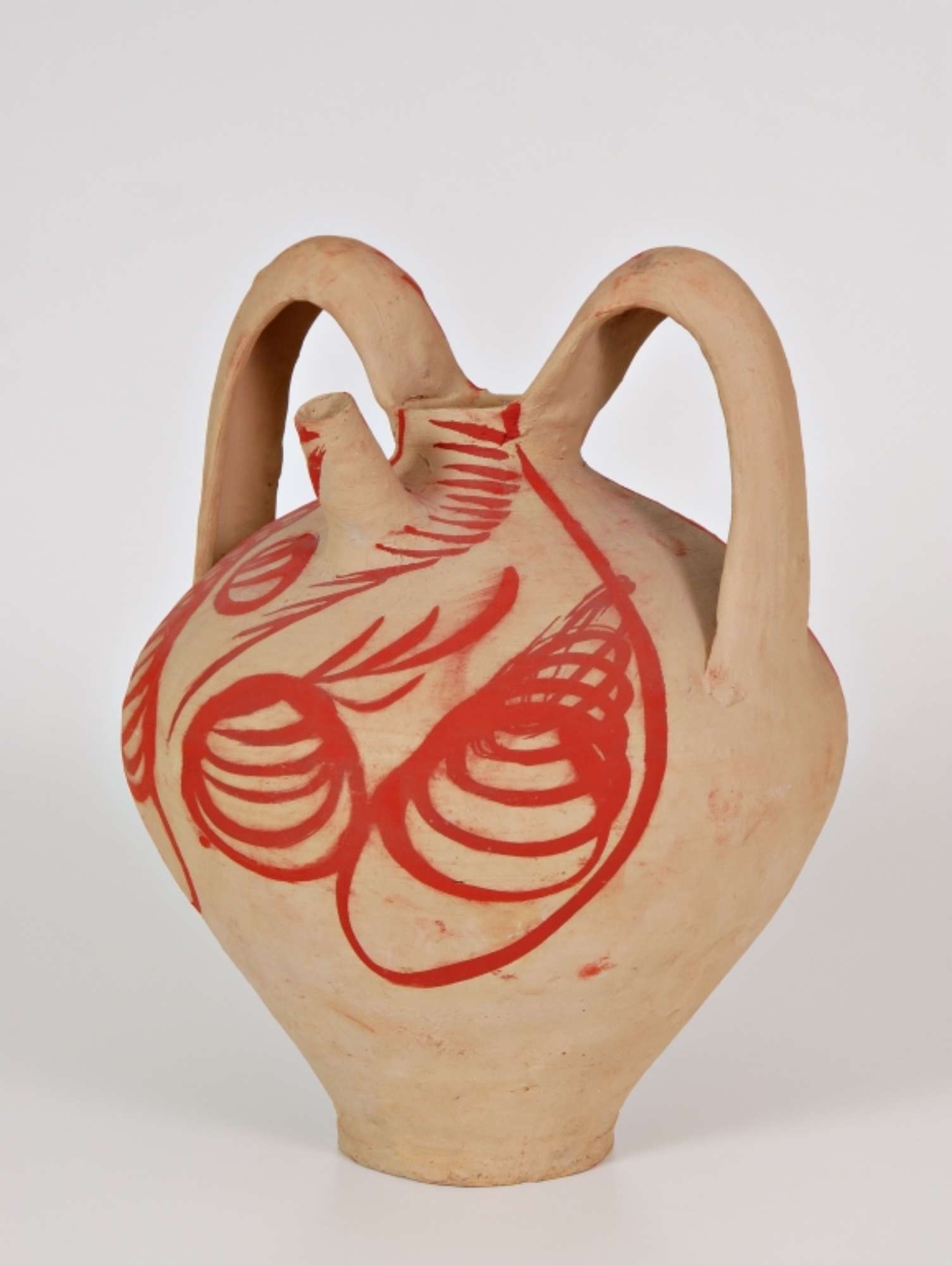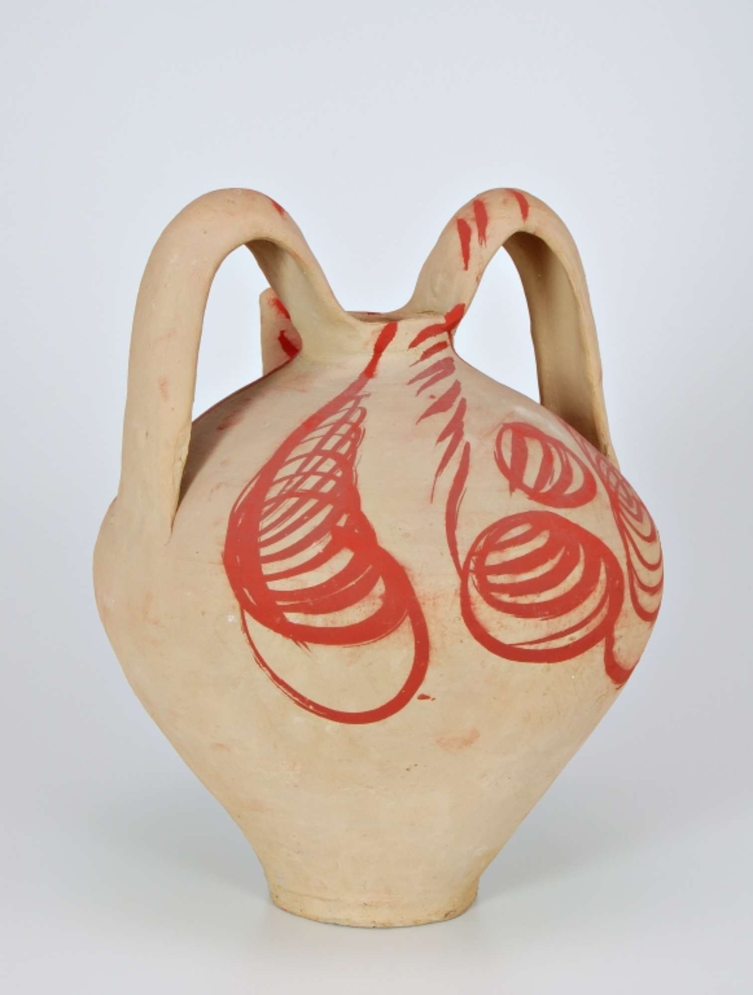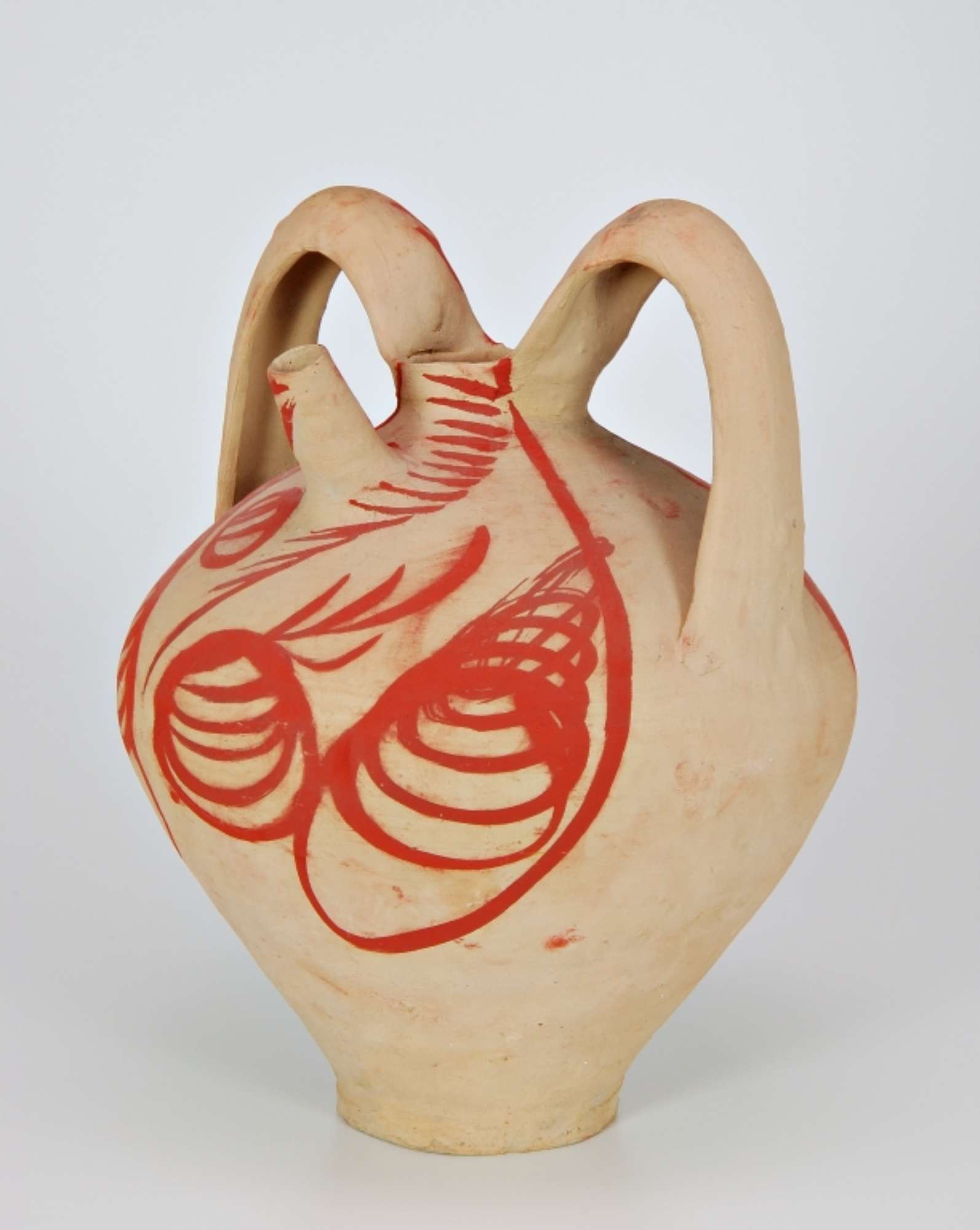 Orcio ("cannàta") a corpo biconico con beccuccio cilindrico sulla spalla, breve colletto e due larghe anse a fascia ricurva verticali e contrapposte. Su ambo i lati è presente una decorazione a freddo in rosso senza rivestimento.