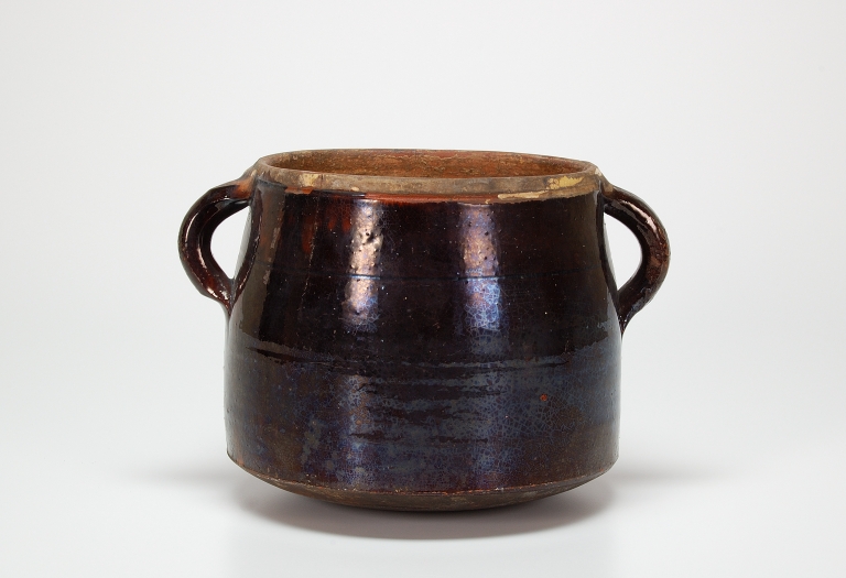 Corpo cilindrico rastremato verso l’alto su base cercinata, due anse verticali e contrapposte. Ingobbiato in bianco all’interno, verniciato in bruno all’esterno.