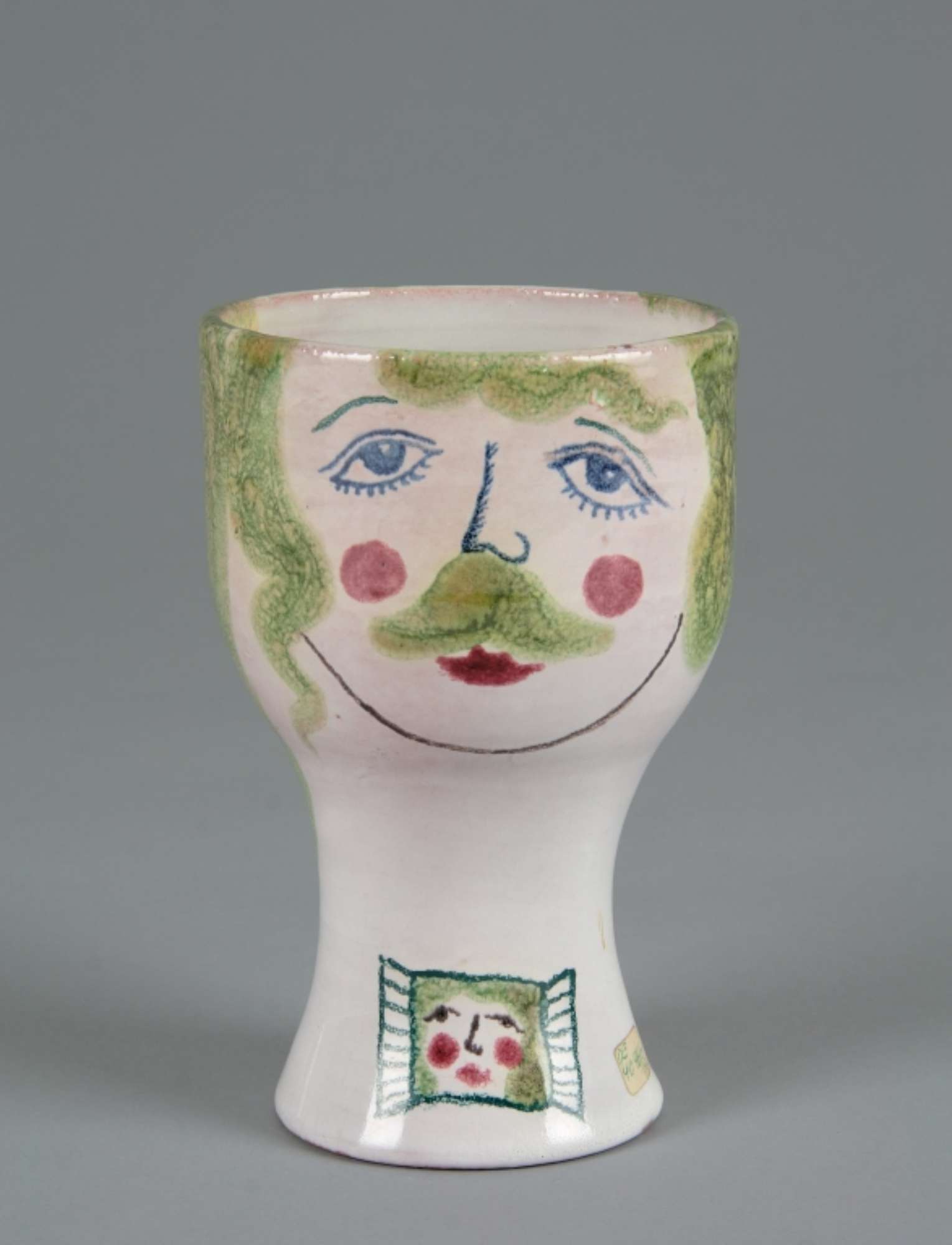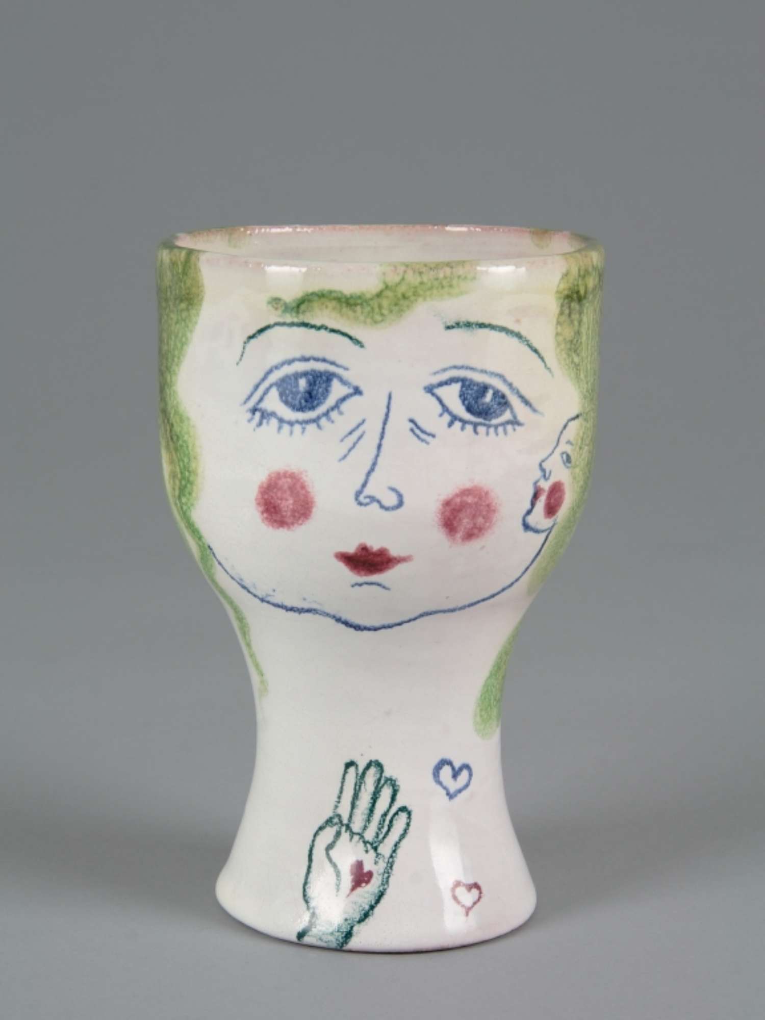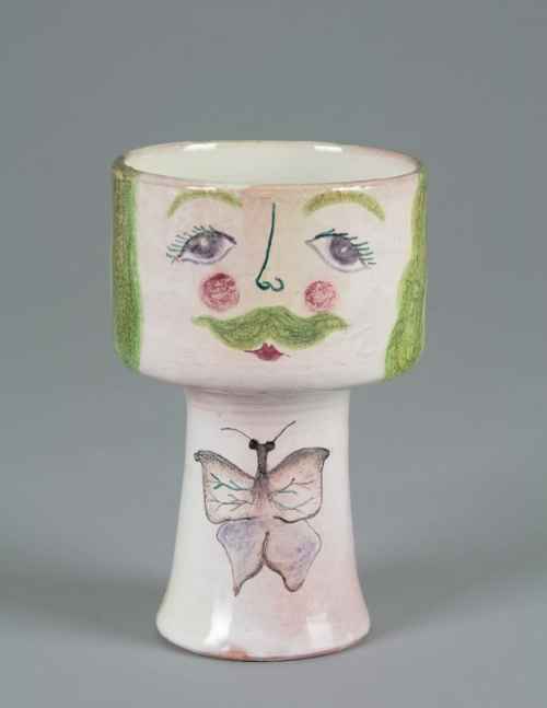 Bicchiere su alto piede. Smalto bianco. Due volti, femminile e maschile, e sul piede mano e finestra aperta con volto all'interno dipinti in policromia. Nel piede la firma VIKOVA in verde.