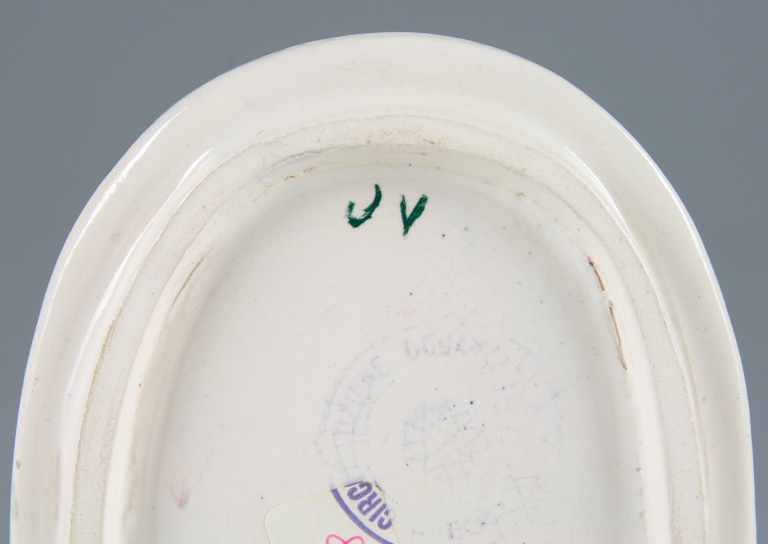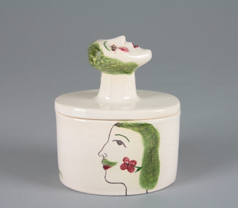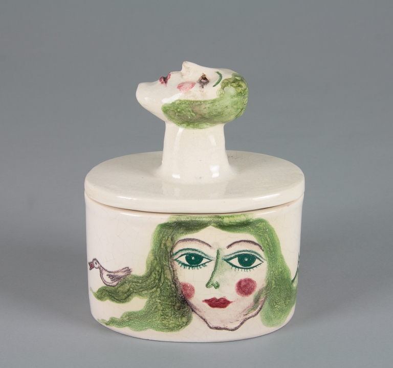 Scatola ovale con coperchio ad alto pomello a testa femminile, smaltato di bianco. Volti, maschile e femminile, con gatto e uccello, dipinti in policromia.