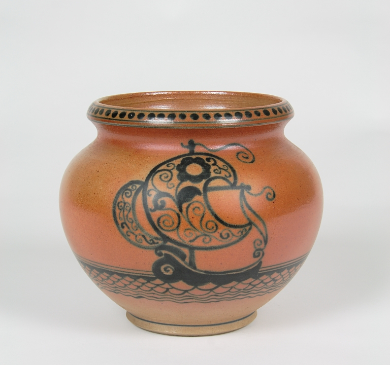 Cache-pot con ventre a bulbo e larga bocca. Decorato con tre barchette a vela su fascia a embricazioni e onde; fascia con palline all'orlo. Dipinto in blu scuro; vetrina rossastra.