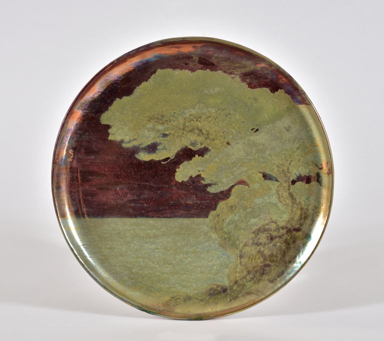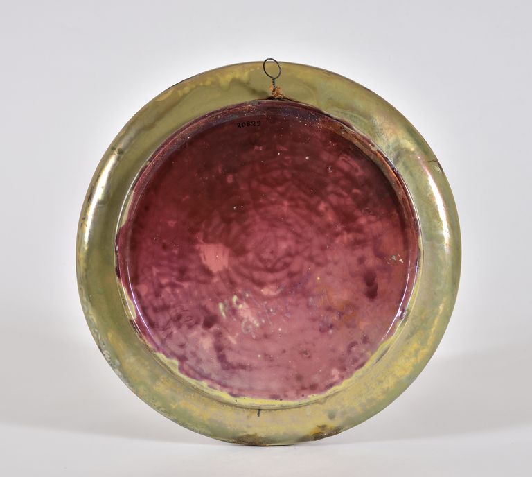 Decorato con alberi sul lato destro e superficie acquatica sullo sfondo. Colori: verde, rosso e blu violaceo. Marcato in verde: M C M GOLFE JUAN; in violaceo: AM 1900 e incisi: CM 1699.