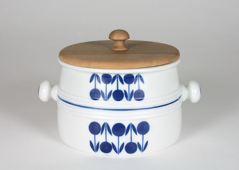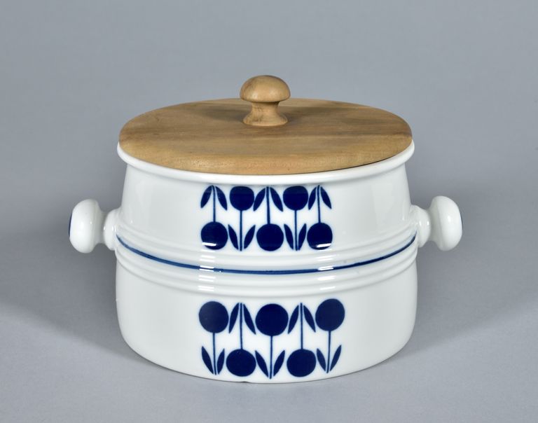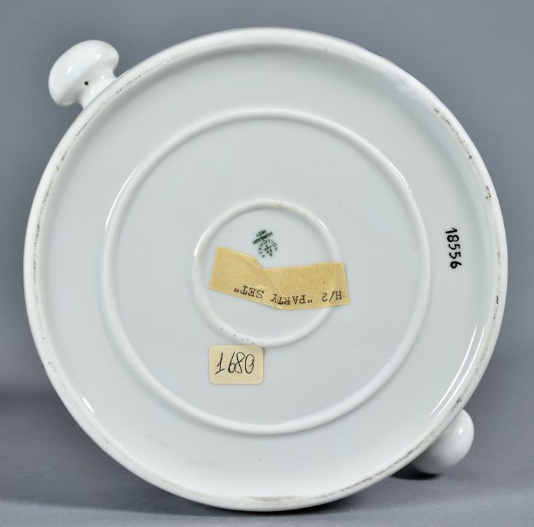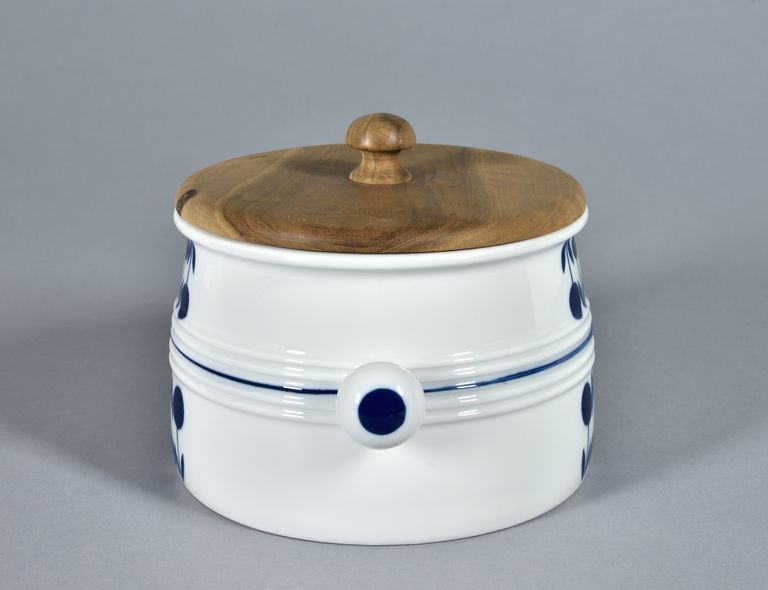 Zuppiera a parete quasi cilindrica con cordonature all'altezza delle anse a bottone, servizio "Party set" con coperchio in legno. Su due lati doppia fila di bacche con foglie, sopra e sotto la cordonatura, filetto a metà zona e dischi sui pomelli in turchino. Nel fondo marca di fabbrica stampigliata in verde.