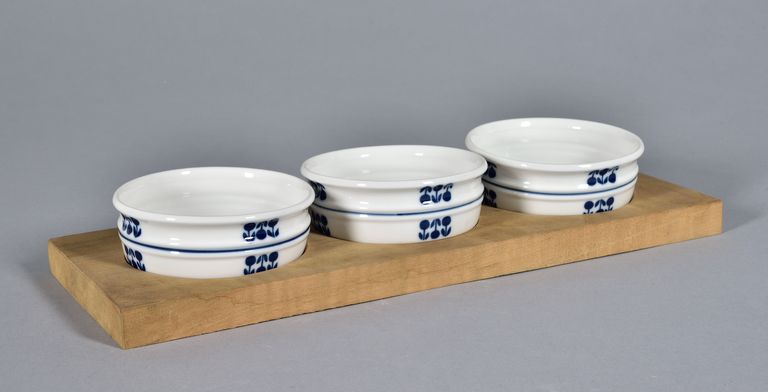 Coppa a parete cilindrica con due cordonature a metà altezza, servizio "Party set". L'elemento può essere inserito su di un vassoio in legno dotato di tre bassi incavi per ospitare le coppe. Filetto a metà altezza e gruppi di tre bacche con foglie su due lati dipinti in turchino. Nel fondo marca di fabbrica stampigliata in verde.
