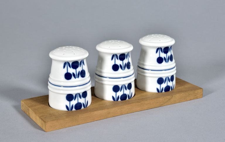 Portasale per servizio "Party set" con quattro cordonature a metà altezza e parte superiore bombata e bucherellata. L'elemento può essere inserito su di un vassoio in legno dotato di tre bassi incavi per ospitare altri oggetti. Su due lati gruppi di tre bacche con foglie disposte in doppia fila, dipinte in turchino.