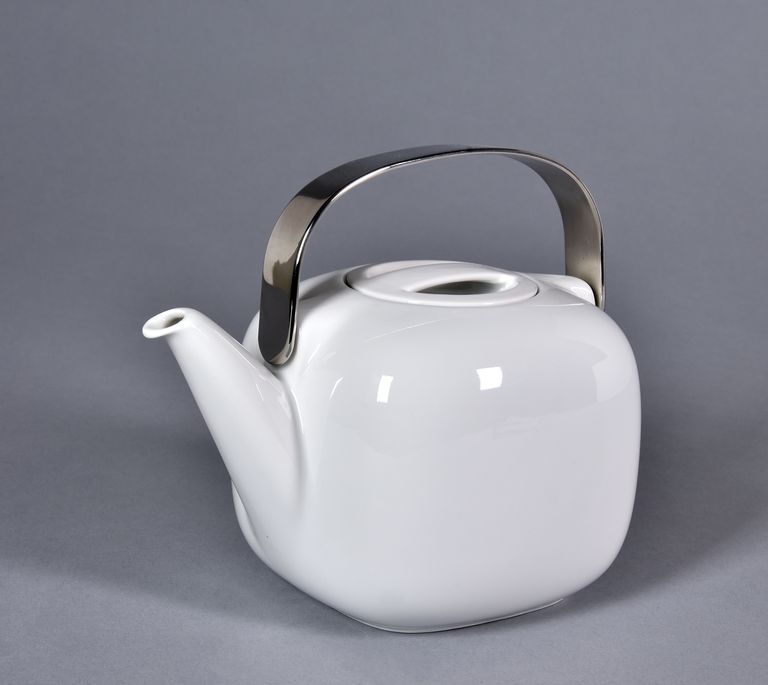 Teiera a parallelepipedo ad angoli arrotondati, beccuccio a tronco conico e coperchio piatto con fascia prensile centrale. Manico in metallo.