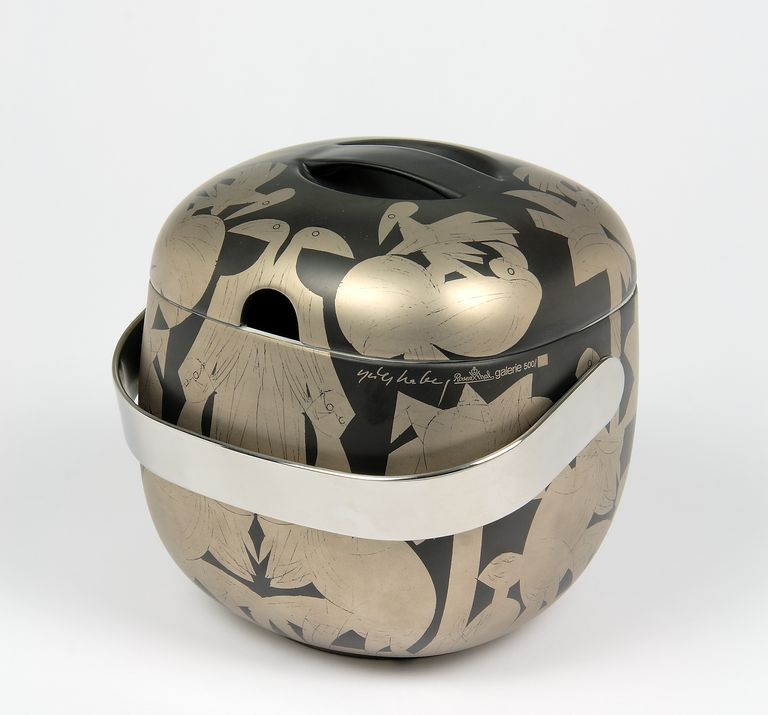 Zuppiera a parallelepipedo ad angoli arrotondati con coperchio ad ansa prensile a nastro, incavo per il cucchiaio. Manico in metallo bianco. Ornato stilizzato a figure, uccelli ed alberi in argento su fondo nero opaco. All'orlo la scritta in argento: "Grieshaber Rosenthal Galerie 500/".Marca di fabbrica stampigliata in verde nel fondo.