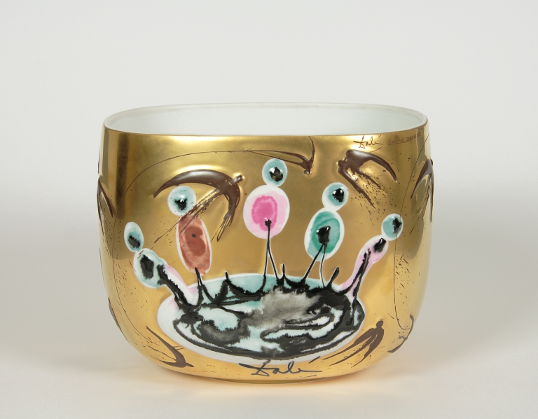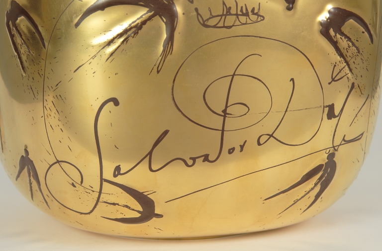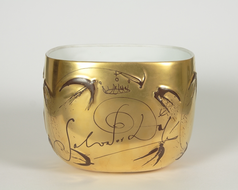 Insalatiera a forma di parallelepipedo ad angoli arrotondati e rastremato alla base. Ornato in leggero rilievo con da un lato cinque elementi che richiamano figure umane uscenti da una forma ovale, dipinti in nero, verde, rosa, bruno e bianco con sotto la firma "Dalì". Sul restante della superficie dorata rondini in volo e un'altra firma "Salvador Dalì" in bruno. All'orlo la scritta: "Dalì Rosenthal Galerie 500/" in bruno. Marca di fabbrica stampigliata in verde nel fondo.