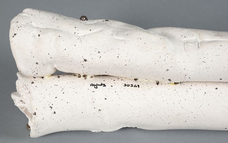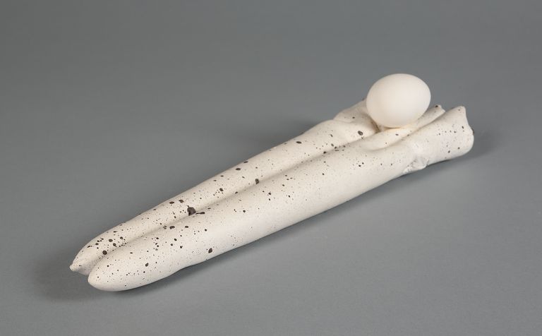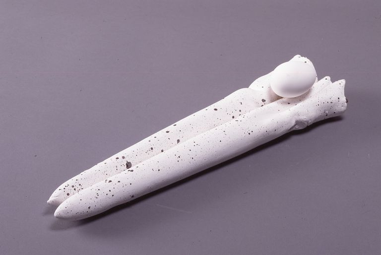 L'opera, a sviluppo orizzontale, è formata da una coppia di tubolari rastremati verso il fondo e slabbrati all'imboccatura, chiusa in parte da un impasto spugnoso. Sulla parte superiore, nell'incavo intermedio, poggia un elemento bianco a forma di uovo. Colore bianco con puntinature in rilievo di colore bruno, senza rivestimenti vetrosi. Porcellana fosfatica con lavorazione a stampo e modellazione plastica; cottura a 1240°C. Firmata sulla base.
