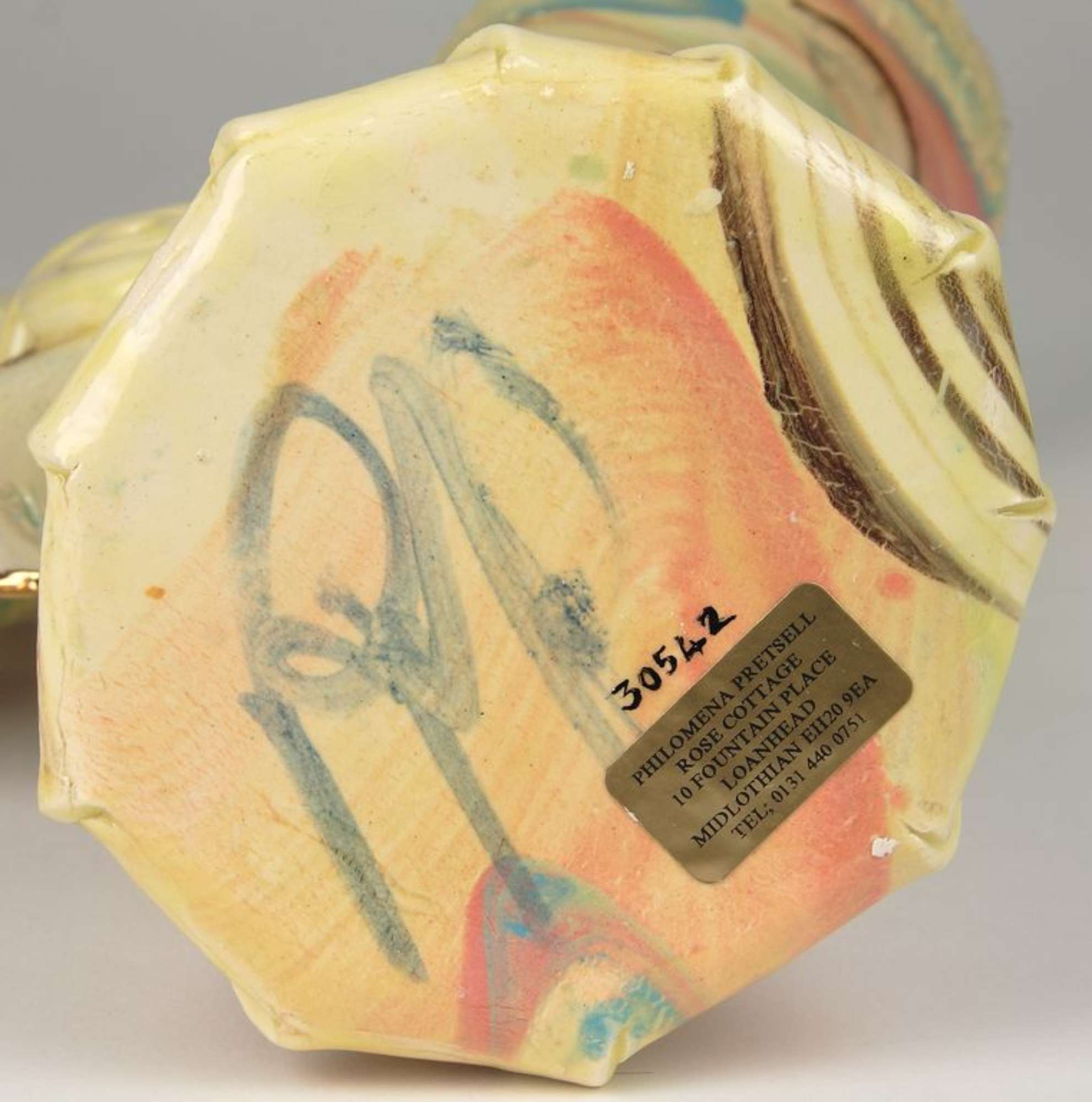 L'opera ha la forma di un vaso dal corpo cilindrico, poggiante su basso piede a sacchetto, sormontato dal beccuccio versatore svasato e rialzato; dotato di presa a foggia di fiocco trattenuto da un medaglione elicoidale. Decorato da motivi astratti nei colori giallo, azzurro, toni di arancio e oro a terzo fuoco. Firmata sulla base con le iniziali (?).