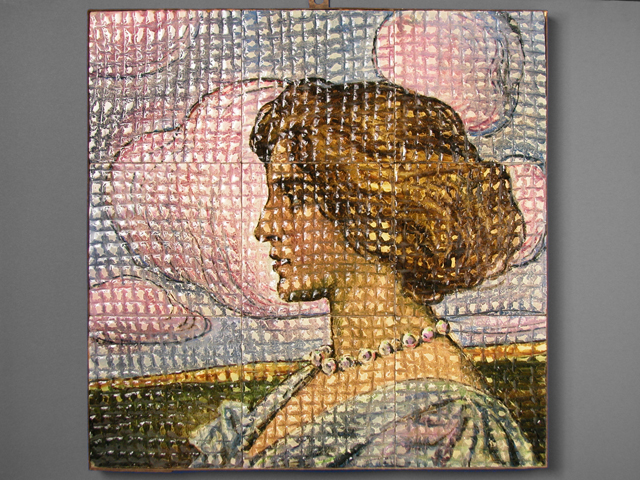 Il pannello è composto da nove piastrelle disposte su tre file modellate, sulla superficie a vista, da reticolato in bassorilievo e da decoro raffigurante un volto femminile di profilo, volto verso sinistra, e sullo sfondo prato e grandi nuvole rosee. La donna ha i capelli raccolti in un'acconciatura; al collo porta un filo di perle messo in risalto dalla scollatura a V della veste. Dipinto in verde, rosa, blu, bruno scuro, bruno rossastro, giallo ambrato, rosso scuro, azzurro e nero.