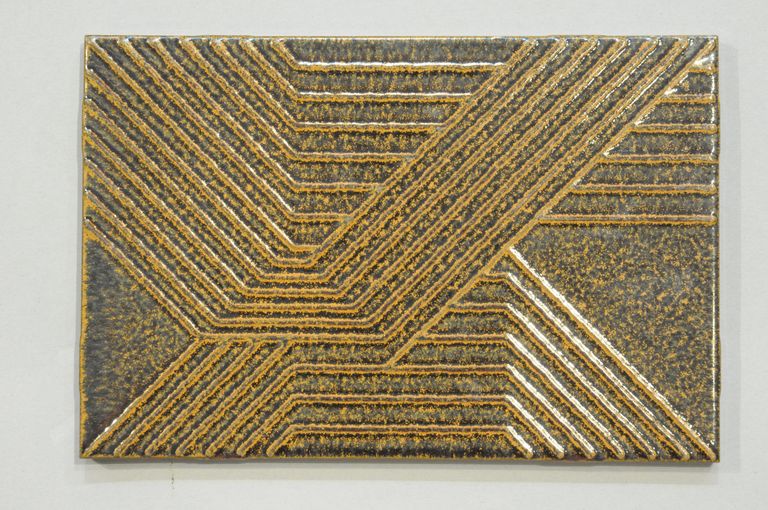 Decorazione geometrica a rilievo a smalto su fondo nero e arancio.