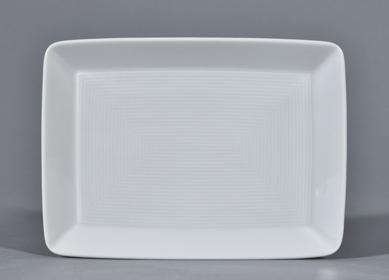 Centro piano di forma rettangolare attorno al quale si aprono le pareti svasate; piede appena accennato. La parte centrale del recto è decorata da una finissima e fitta sequenza di rettangoli concentrici incisi nell'impasto. Sul fondo, in verde, è stampigliata la marca: Thomas/ GERMANY/ spulmaschinenfest/ mikroweliengeeignet.