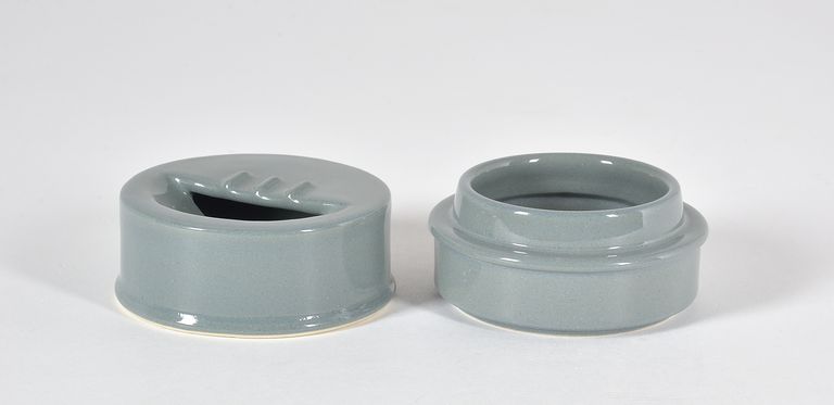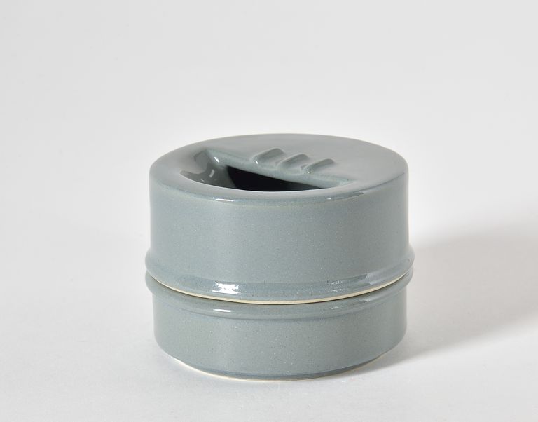 Di forma cilindrica con calotta superiore divisa a metà ed una parte inclinata verso l'interno; smaltato in grigio.