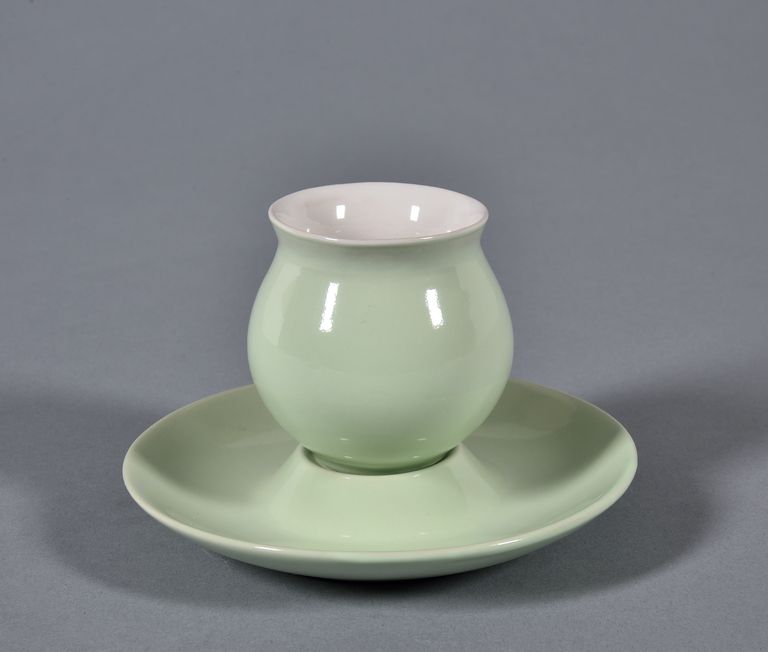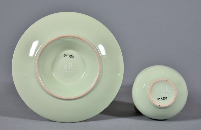 "Colore" tazzina a corpo sferico, a doppia parete (quella interna preserva il calore e quella esterna, isolante, per tenerla in mano senza scottarsi) con piccolo bordo svasato ed orlo arrotondato; piede appena accennato con fondo incavato. Piattino con parete svasata e orlo arrotondato; centro rialzato con piccolo incavo per l'alloggiamento del piede della tazzina. Colore verde chiaro. Sul fondo in bianco è stampigliata la dicitura: stile / LAVAZZA