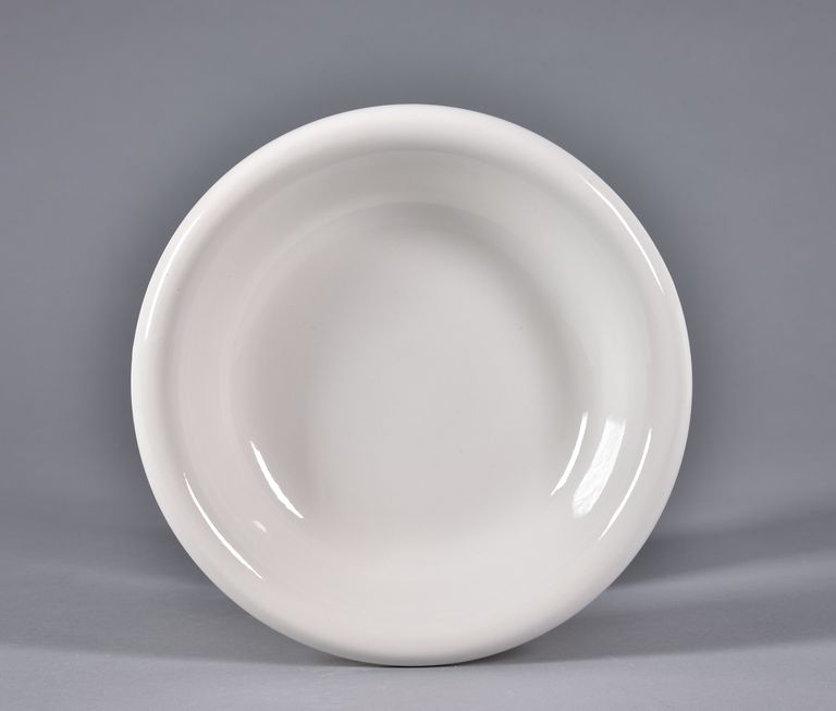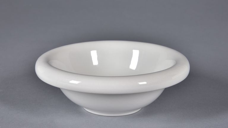 Ciotola con piede circolare e base incava all'interno. Interno concavo, dal profilo ovoidale, con l'orlo molto estroflesso e arrotondato. Colore bianco dell'impasto con vetrina trasparente lucida.