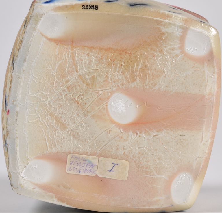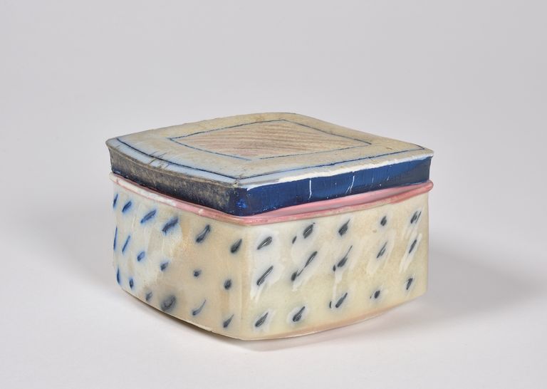Scatola dalla base quadrangolare, con i lati leggermente bombati e irregolari; bordo e battente del coperchio in aggetto. Decori segnici graffiti sul corpo e sul coperchio, dipinti con colori blu e rosa. Vetrina trasparente con effetti puntinati di colore ruggine (per effetto delle ceneri di cottura) che lascia vedere il bianco della porcellana. Cottura a 1300°C in forno a legna (anagama).