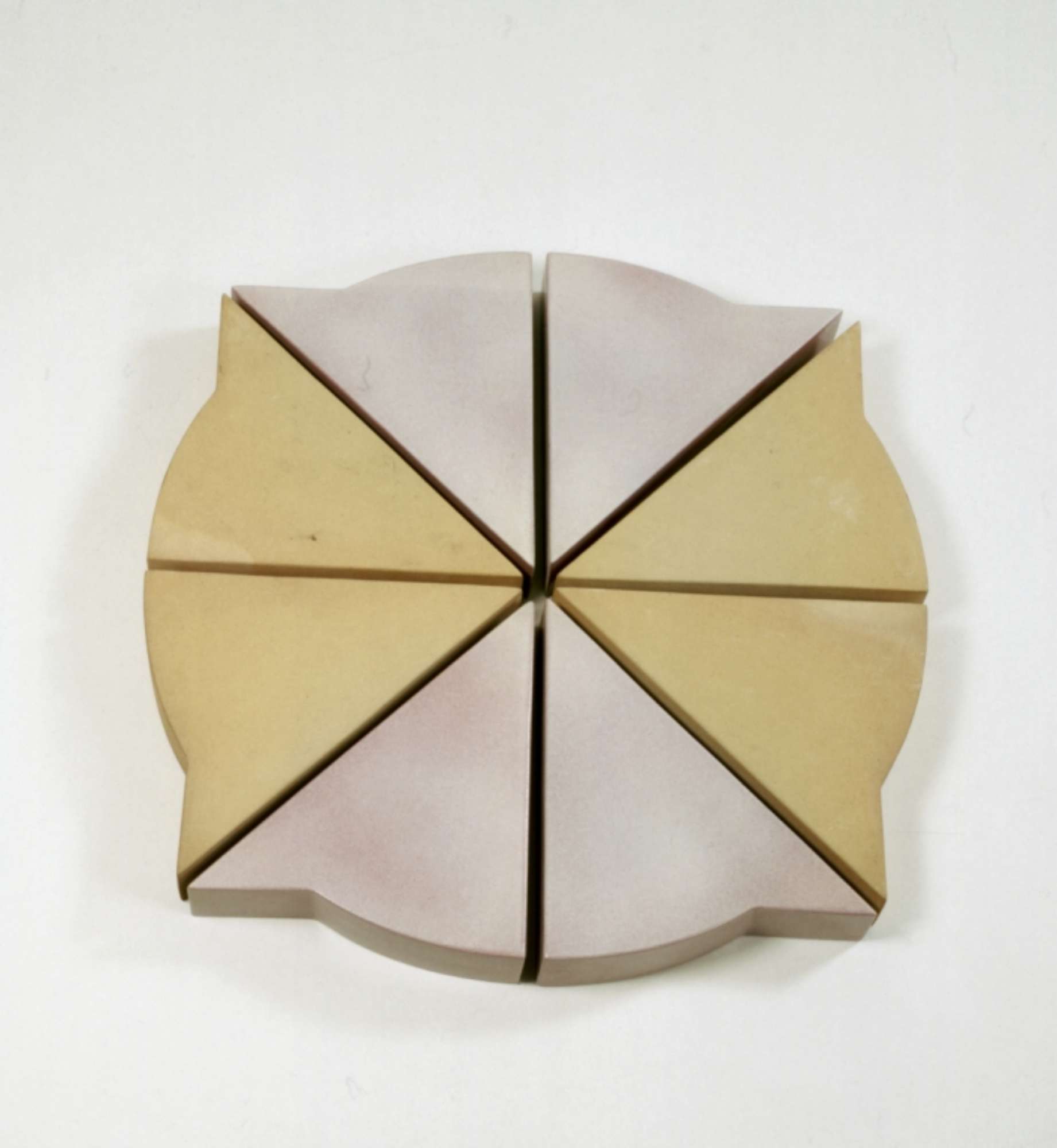 L'opera, dall'aspetto minimalista, nasce dalla sovrapposizione di un cerchio e di un quadrato ed è composta da otto moduli triangolari, affiancati in modo simmetrico, alternando due moduli smaltati e due senza smalto. Colore rosso della terracotta e colore sfumato dal rosa al lilla e al bianco con puntinature nello smalto (sull'intera superficie).