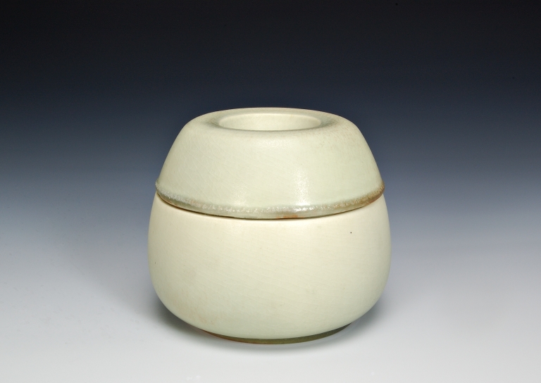 Contenitore a corpo ovoidale, battente per coperchio obliqua, con piede circolare rientrante. Coperchio che completa la forma ovoidale del corpo, con la parte superiore piatta e grande incavo obliquo all'interno. Colore beige matt all'interno e sull'intera superficie esterna, con sfumature di colore grigio-verde e ruggine con leggero effetto craquelé. Impasto bianco, foggiatura al tornio e cottura ad alta temperatura.