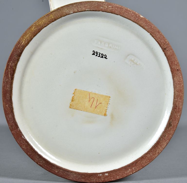 Contenitore con la base incava, composto da tre ordini sovrapposti divisi da un cordolo a spigolo vivo: piede troncoconico leggermente estroflesso alla base, corpo cilindrico e zona superiore a calotta emisferica, con due beccucci cilindrici obliqui simmetrici; ansa a nastro semicircolare all'altezza del corpo cilindrico. Smalto bianco lucido sull'intera superficie; spigoli di colore ocra tostato (non coperti dallo smalto). Impasto rosso, foggiatura al tornio e cottura ad alta temperatura.