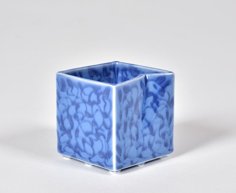 Piccolo bicchiere a forma cubica, rialzato su tre piccoli piedini collocati su ogni lato. Tre delle pareti sono verticali, mentre la quarta è piegata ad angolo verso l'interno; orlo orizzontale. Colore azzurro con decorazione arabescata di colore blu con sfumature grigie.