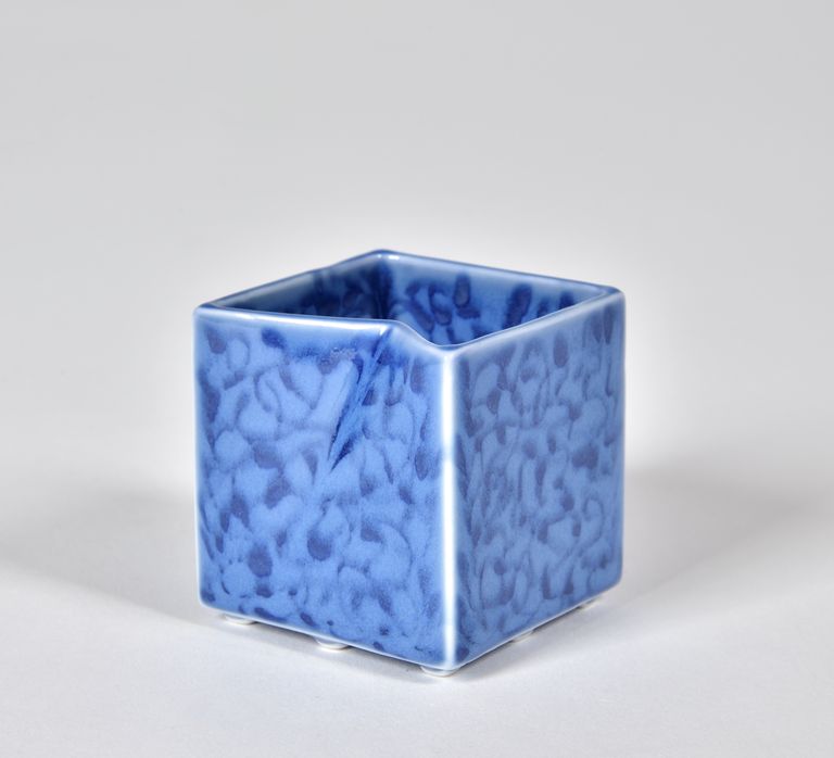 Piccolo bicchiere a forma cubica, rialzato su tre piccoli piedini collocati su ogni lato. Tre delle pareti sono verticali, mentre la quarta è piegata ad angolo verso l'interno; orlo orizzontale. Colore azzurro con decorazione arabescata di colore blu con sfumature grigie.