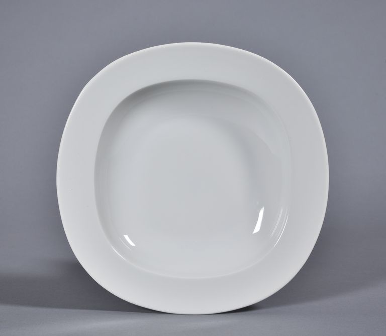 Piatto fondo con piccolo piede e base incava. Pianta quadrangolare con gli angoli arrotondati, cavetto quadrangolare concavo e tesa piccola leggermente inclinata, con l'orlo arrotondato. Impasto bianco, foggiato a colaggio, rivestito con vetrina trasparente e cotto ad alta temperatura.