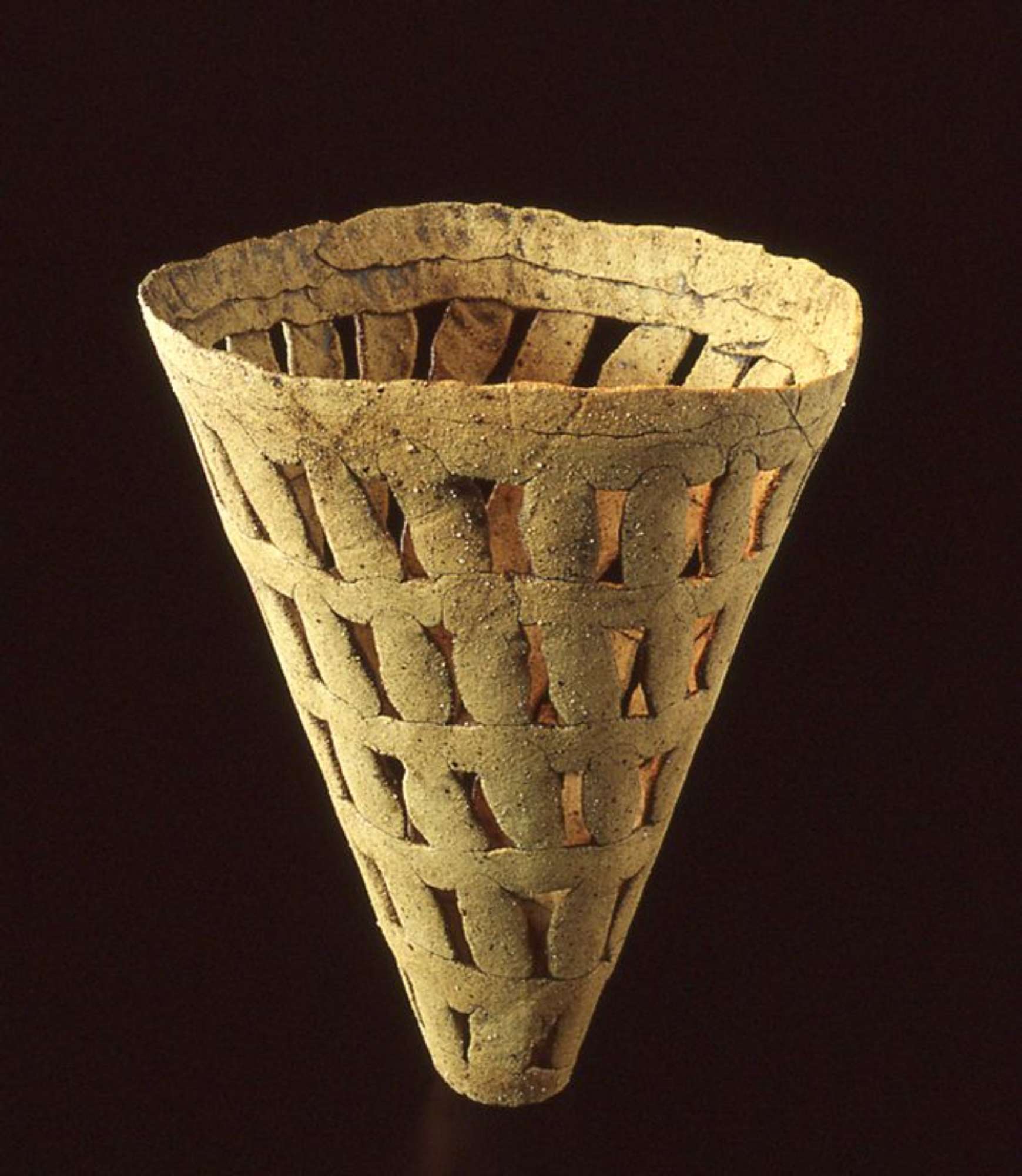 Vaso traforato apodo, dal profilo troncoconico, con base stretta, bocca larga irregolare con orlo a spigolo frastagliato. Costruito con cinque ordini di colombini verticali, leggermente inclinati, intrecciati a lunghi colombini orizzontali, con superficie ruvida dovuto alla chamotte.