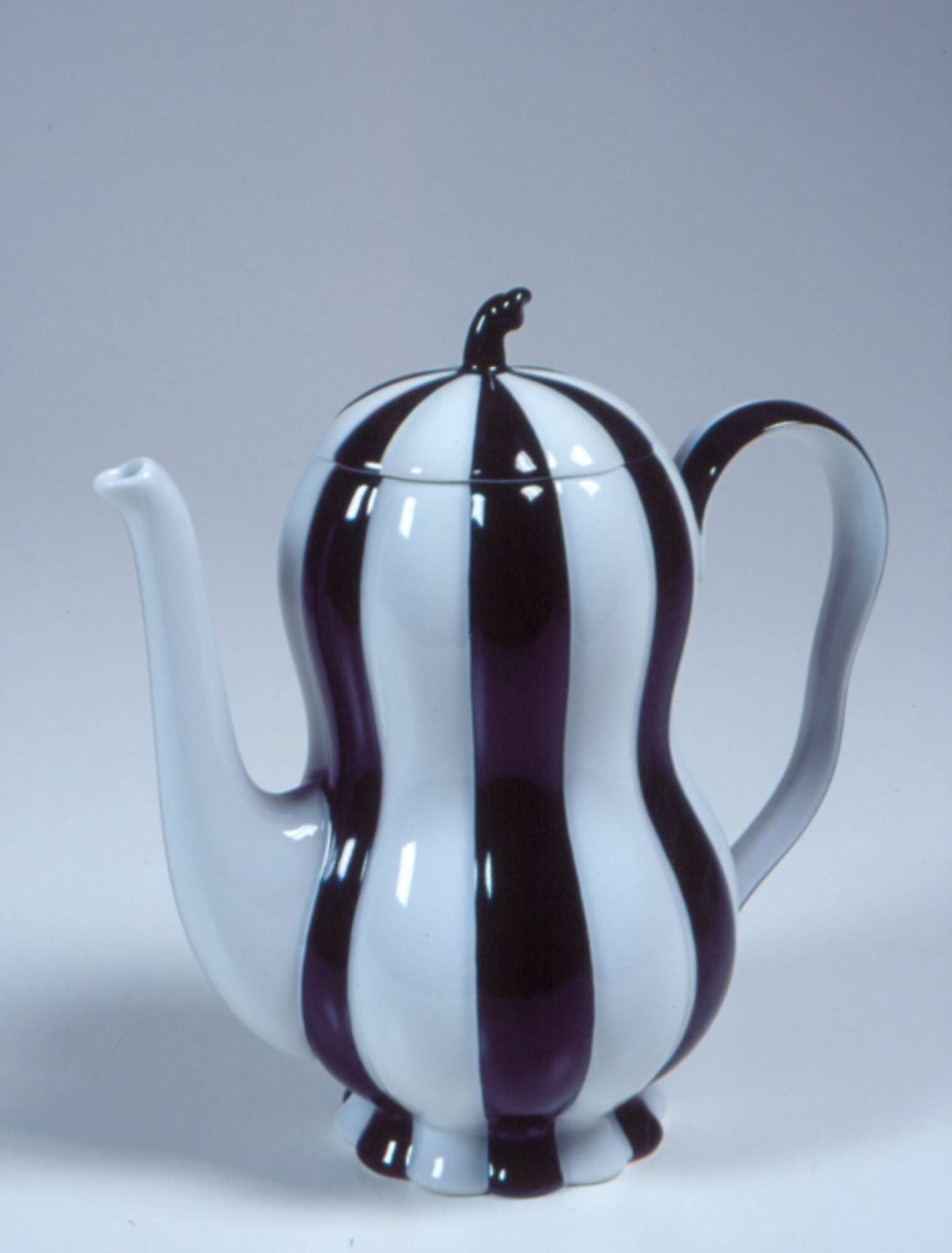 Caffettiera piriforme con decorazione a bande verticali in nero.