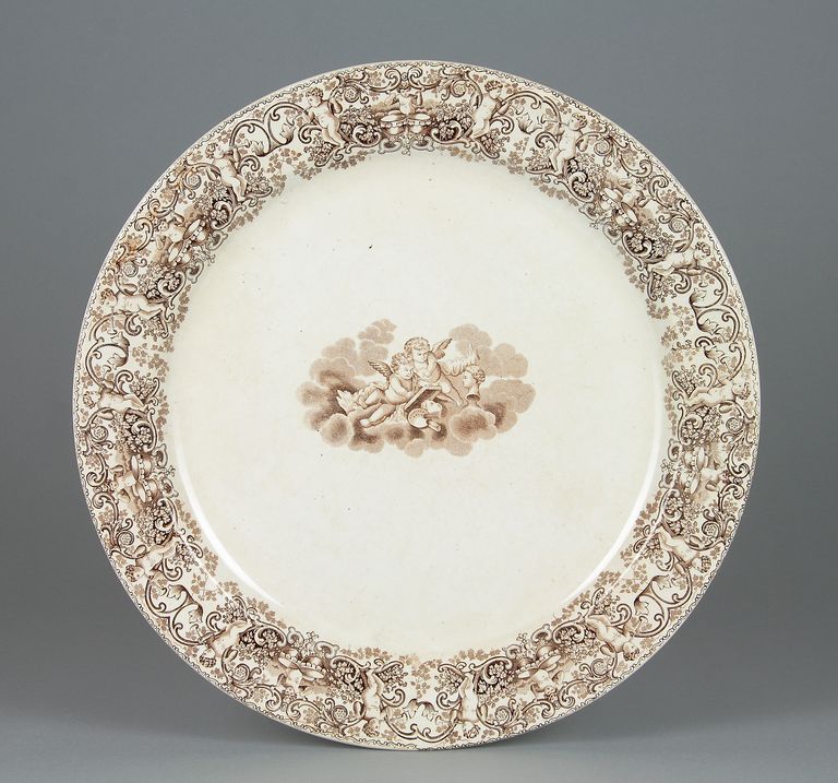Piatto ad ampio cavetto e breve tesa, decorato a decalcomania col motivo “Amori”, in monocromia bruna con, al centro, un piccolo gruppo di putti alati che ritraggono un busto femminile su nuvole; sulla tesa corre una fascia con riserve rocaille fogliate e fiorite animate da putti.