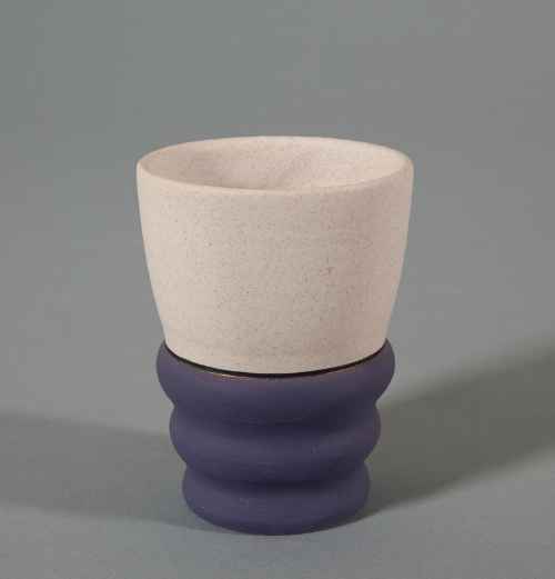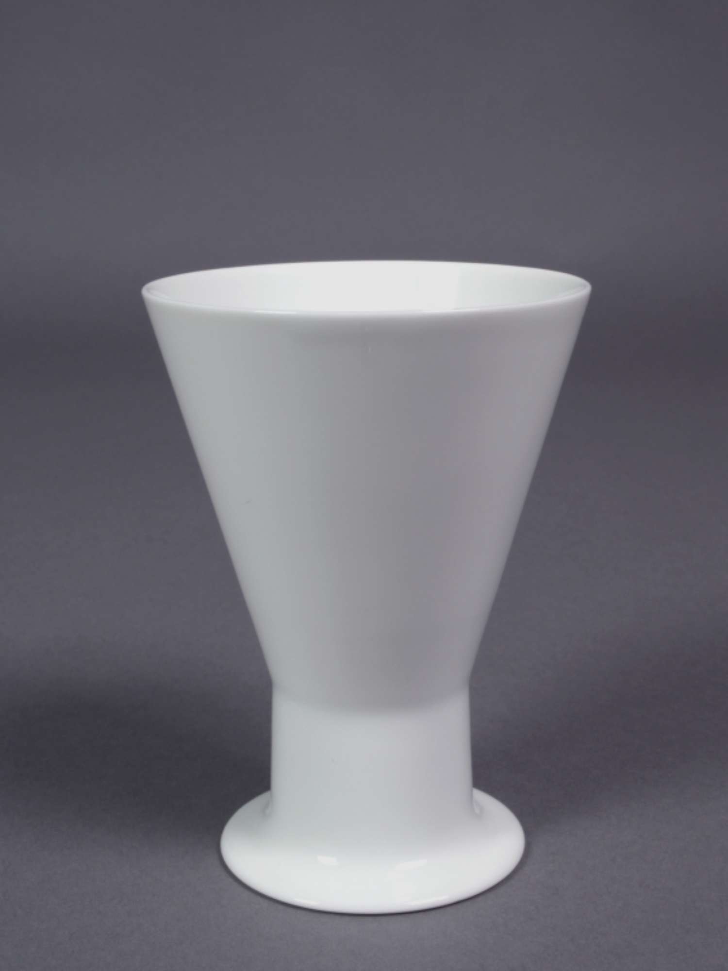 Piccola coppa troncoconica alta e stretta ad orlo sottile, poggiante su piede cilindrico dalla base estroflessa. Impasto bianco, foggiatura a colaggio, colore bianco lucido sull'intera superficie, vetrina trasparente e cottura ad alta temperatura.