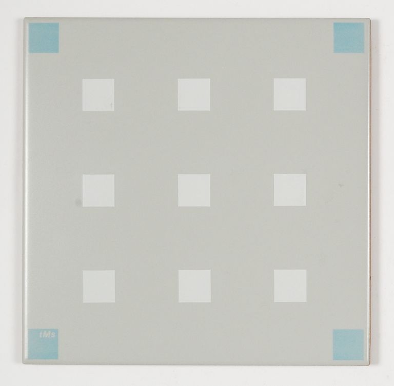 Due piastrelle della serie "Milan Style" decorate a serigrafia con quadrati in bianco al centro e quadrati in azzurro agli angoli, su fondo grigio.