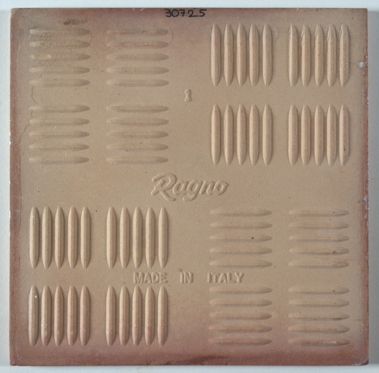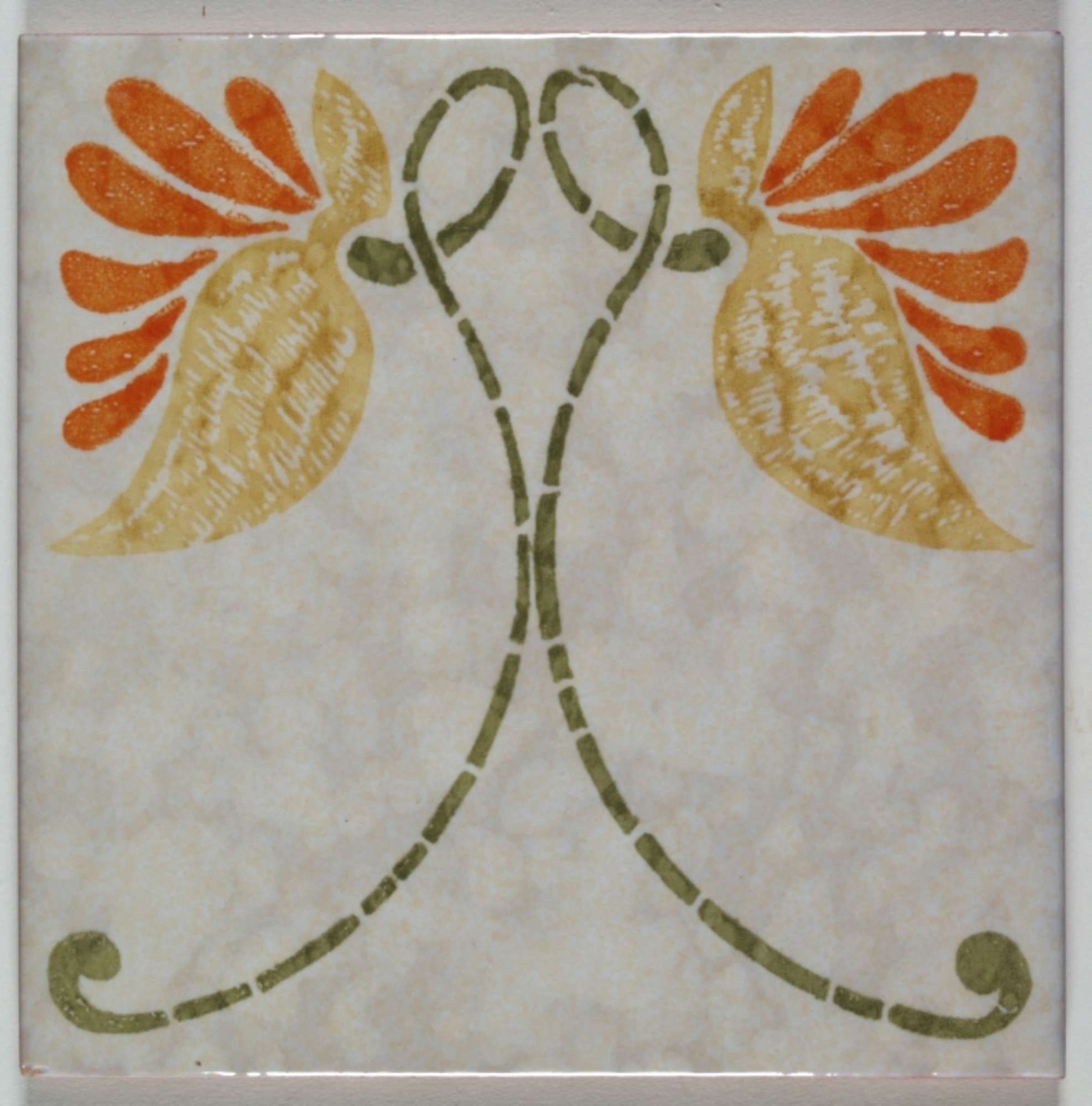 Piastrella rivestita di smalto in parte applicato per gocciolatura e con una nuvolatura di colore beige e tre applicazioni serigrafiche. Decoro floreale simmetrico in arancio, giallo e verde.