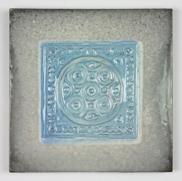 Piastrella in maiolica foggiata allo stato plastico smaltata e riflessata a lustro a terzo fuoco. Disegno centrale in bassorilievo colorato in blu con smalto di fondo grigio lucido cavillato.