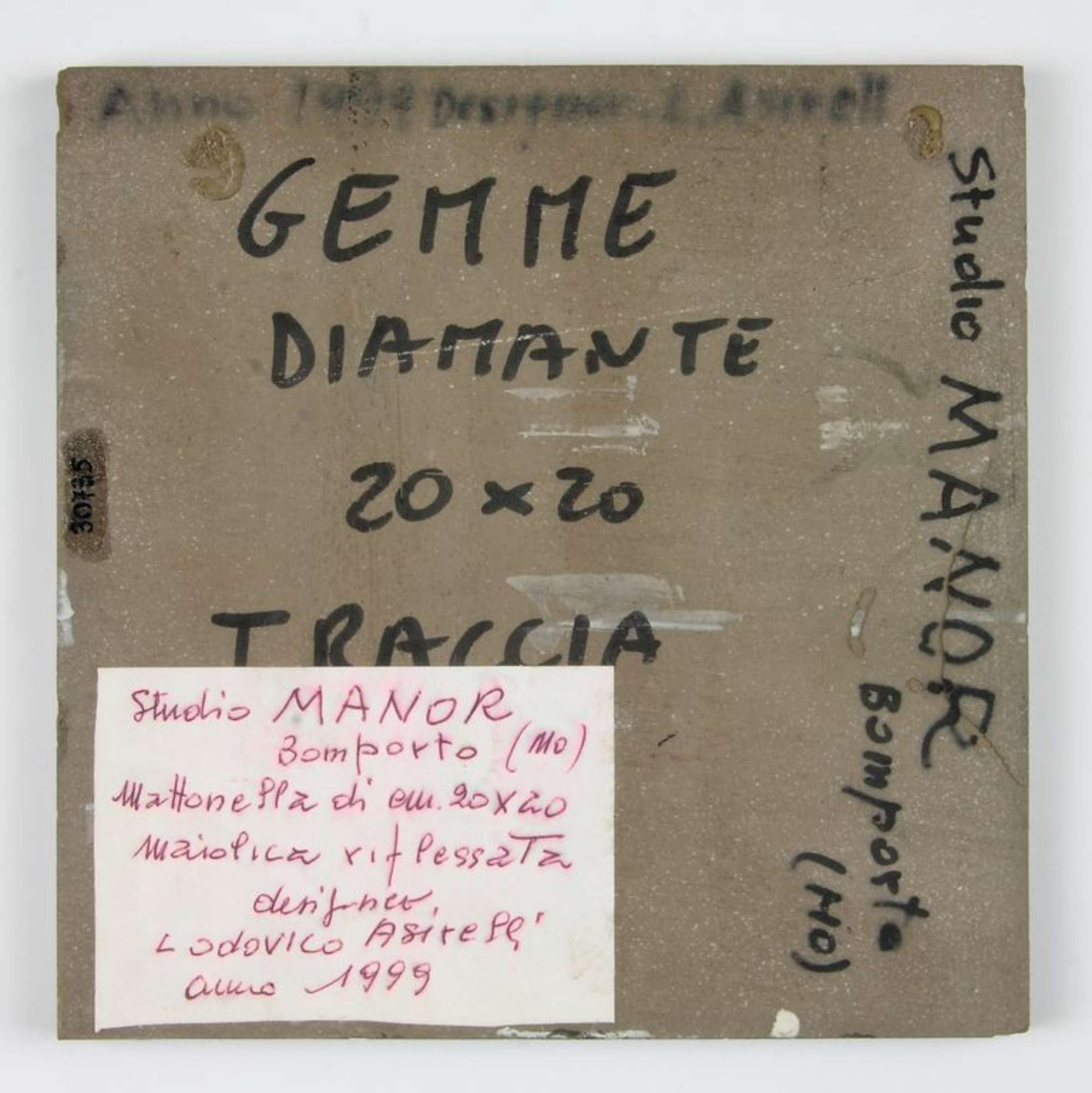 Nel retro a pennarello è scritto "Studio MANOR/ Bomporto (MO)/ Anno 1999 Designer l. Asirelli" e "GEMME/ DIAMANTE/ 20×20/ TRACCIA". Al centro è presente un'etichetta che riporta "Studio MANOR/ Bomporto (MO)/ mattonella di cm 20×20/ in maiolica riflessata/ III cottura/ designer/ Lodovico Asirelli/ anno 1999".