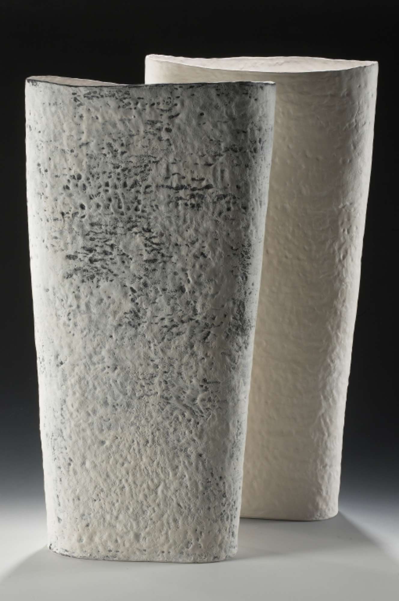Opera costituita da due grandi vasi a sezione ellittica, bianchi, uno dei quali dipinto in nero e bianco.