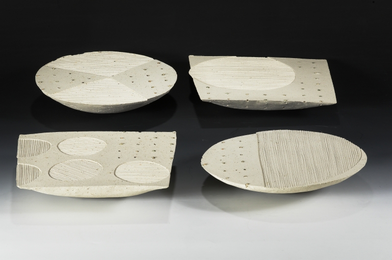 Opera composta da due elementi circolari e due quadrangolari contrapposti; forme geometriche impresse sulla superficie, alternate a piccoli rilievi disposti in file regolari. Colore bianco, impasto chamottato con ossidi di ferro e di rame.