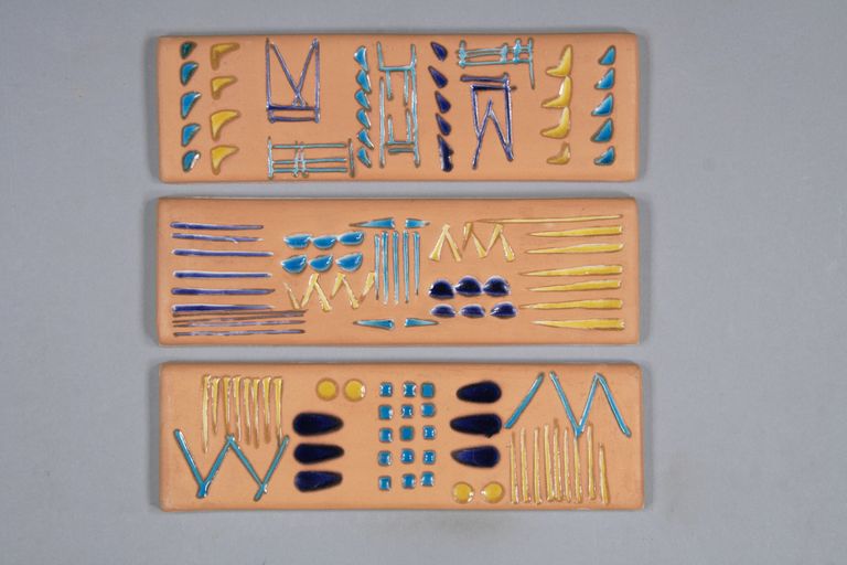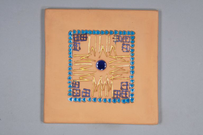 Piastrella e listelli facenti parte della produzione della "Linea Sumeri". La foggiatura è avvenuta per pressatura allo stato semi plastico. I tratti in bassorilievo sono stati smaltati e colorati in policromia a gran fuoco, mentre l'impermeabilizzazione della restante superficie è stata fatta a cera. Colori utilizzati sono blu, giallo, turchese e verde.