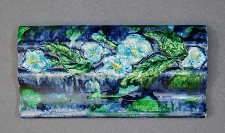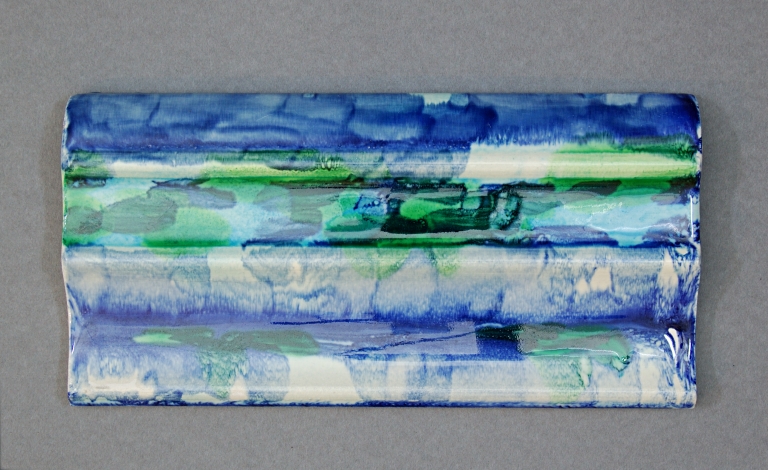 Prototipi: due listelli formato speciale sagomati, uno dalla decorazione floreale a rilievo e uno tinta unita, decorati con pennellate azzurre, blu, gialle e verdi. I colori hanno trasmigrato per l'alta fusibilità della cristallina.