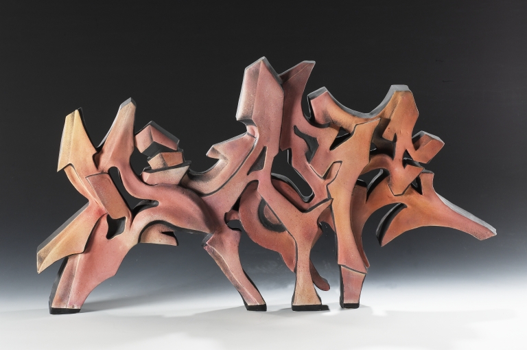 Scultura astratta a tutto tondo, composta da elementi geometrizzanti sovrapposti. Colori beige-rosato e nero.