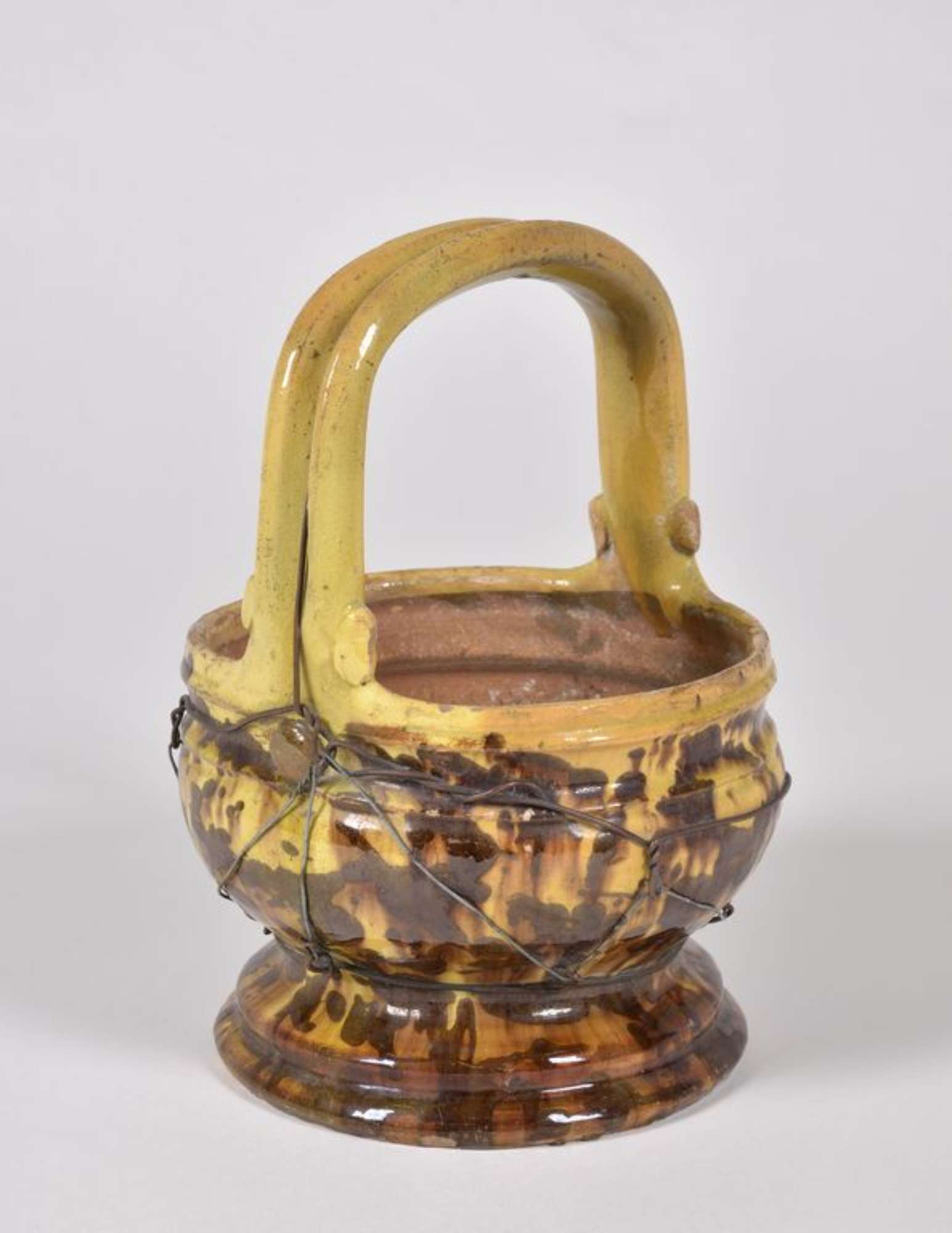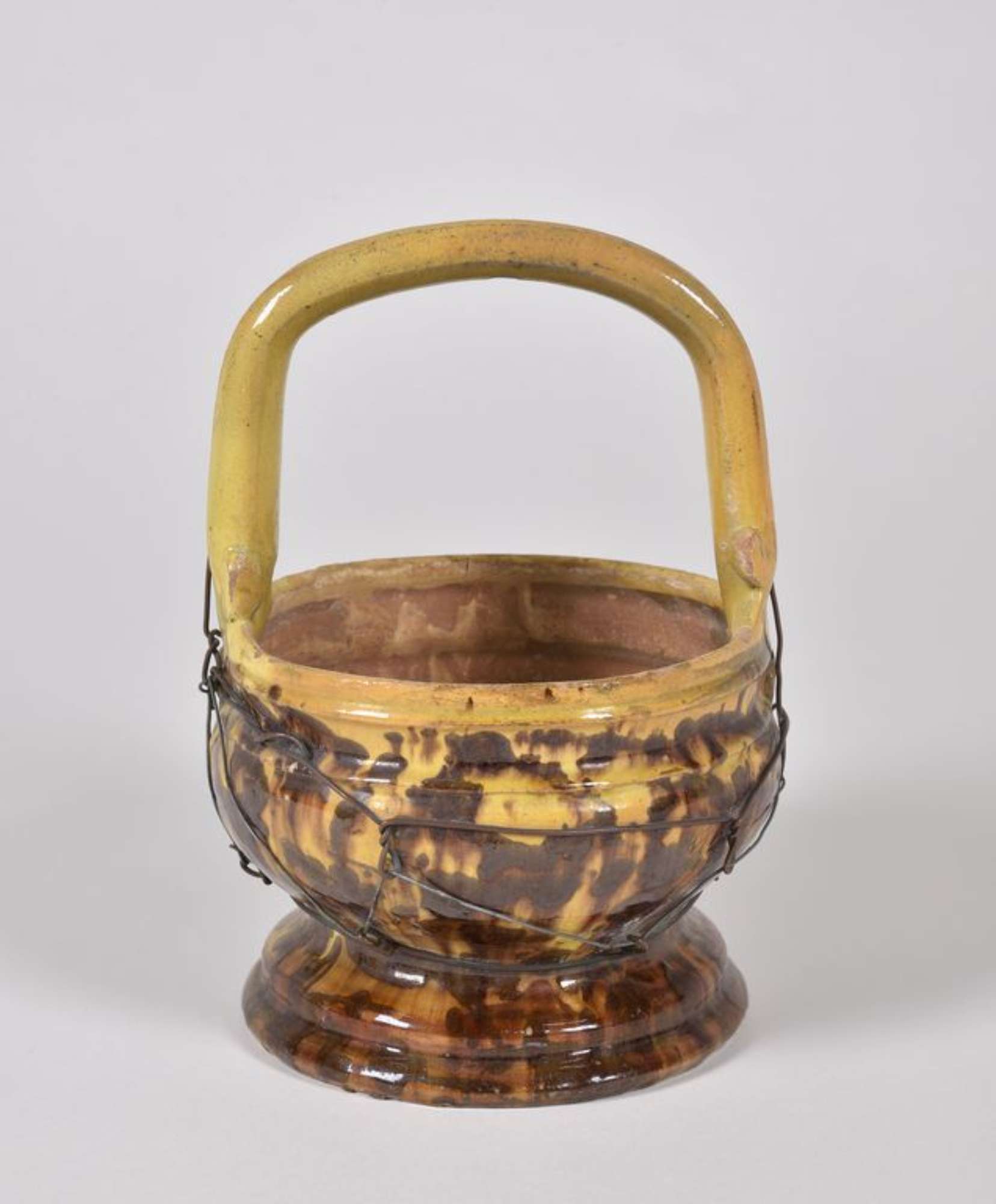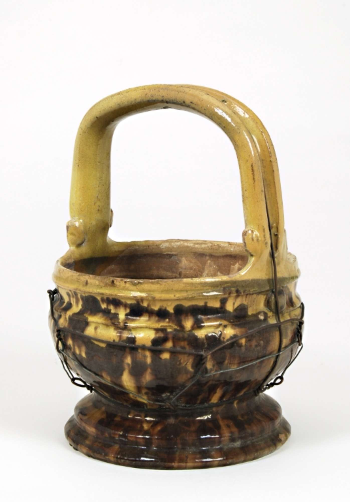Scaldino a cestino, su piede circolare e ansa verticale solcata a metà dove passa un filo di ferro che avvolge anche la pancia. Dipinto a maculazioni brune con invetriatura giallastra.