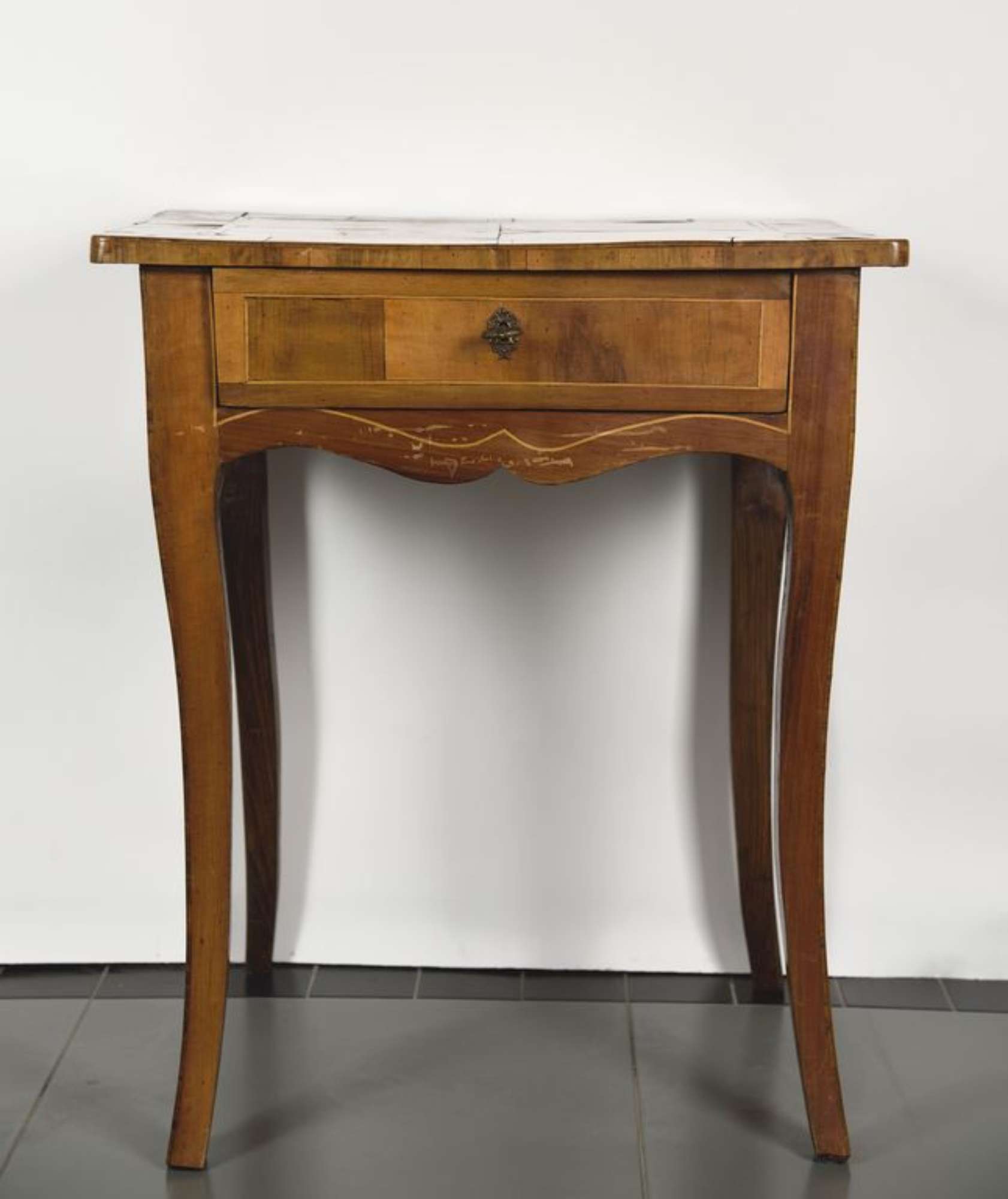 I sostegni sono leggermente a sciabola, la fascia, che presenta sul fronte un piccolo cassetto profilato, è sagomata e presenta una sottile filettatura più chiara che ne richiama il motivo decorativo. Il piano di modesto spessore è mosso da un'ampia cornice formata da tarsie lignee squadrate e da una sottile profilatura.