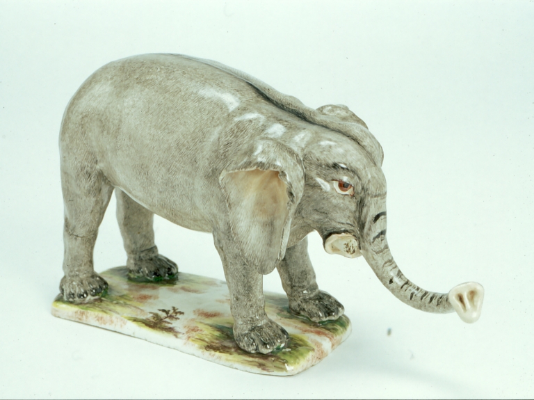 Elefante modellato naturalisticamente: la proboscide è alzata, le zanne sono lacunose, il piedistallo su cui poggia simula una vegetazione esotica. Il pelo dell'animale è reso con una fitta serie di sottili pennellate di colore grigio, gli occhi sono rossi.