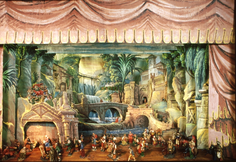 La scengrafia è composta da boccascena, quinte, principali, spezzati e fondali. Il boccascena è dipinto a finto drappeggio rosa. Le quinte, i principali, gli spezzati e i fondali sono composti da pannelli separati: in basso in primo piano c'è la capanna della Natività chiusa da speroni rocciosi, palme e vegetazione rigogliosa, ruderi classici e una casa rustica che scalano in profondità, al centro una cascata con un ponte, a destra un caseggiato fortificato chiude la scena.