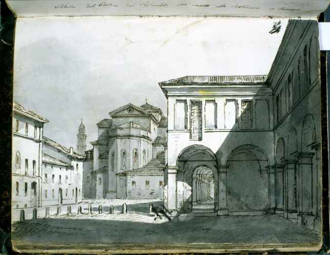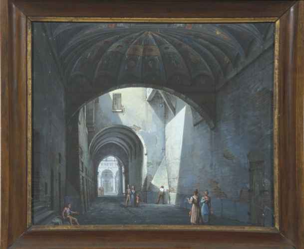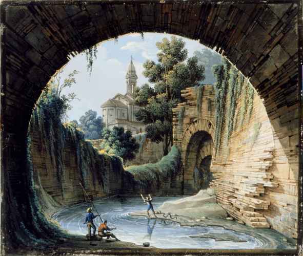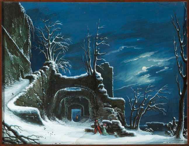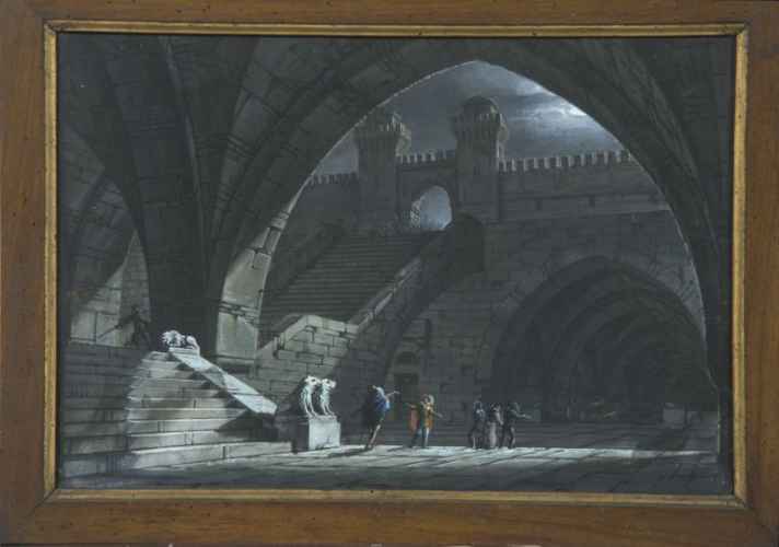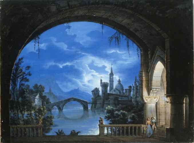 La scenografia, sapientemente orchestrata secondo l'eclettica cultura operistica del tempo, coniuga un'organica divisione degli spazi ad un gusto prettamente romantico. Il palcoscenico infatti è articolato secondo diversi pannelli che simulano perfettamente una scena di teatro vera e propria e danno inoltre profondità e mobilità alla scena. L'evento rappresentato è poi inserito in una ricca e immaginifica vegetazione che lascia spazio a sua volta a rovine ed altre costruzioni dal sapore classico.