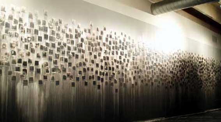 Installazione costituita da numerose lastre quadrangolari (tipo Polaroid) fissate al muro in maniera irregolare poi spruzzate con vernici grigie che colano sul muro.